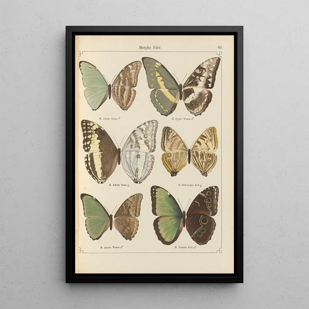 La reproduction de "Papillons exotiques Pl069" d'Otto Staudinger est une véritable ode à la beauté de la nature. Les couleurs vibrantes des ailes des papillons, allant des bleus éclatants aux jaunes dorés, se mêlent harmonieusement pour créer une atmosphère à la fois joyeuse et apaisante. La technique de l'aquarelle, utilisée avec finesse, donne vie à chaque détail, des nervures délicates des ailes aux ombres subtiles qui les entourent. Ce tableau invite à une contemplation attentive, où chaque regard révèle une nouvelle nuance et une nouvelle émotion, comme si les papillons s'apprêtaient à s'envoler hors de la toile.