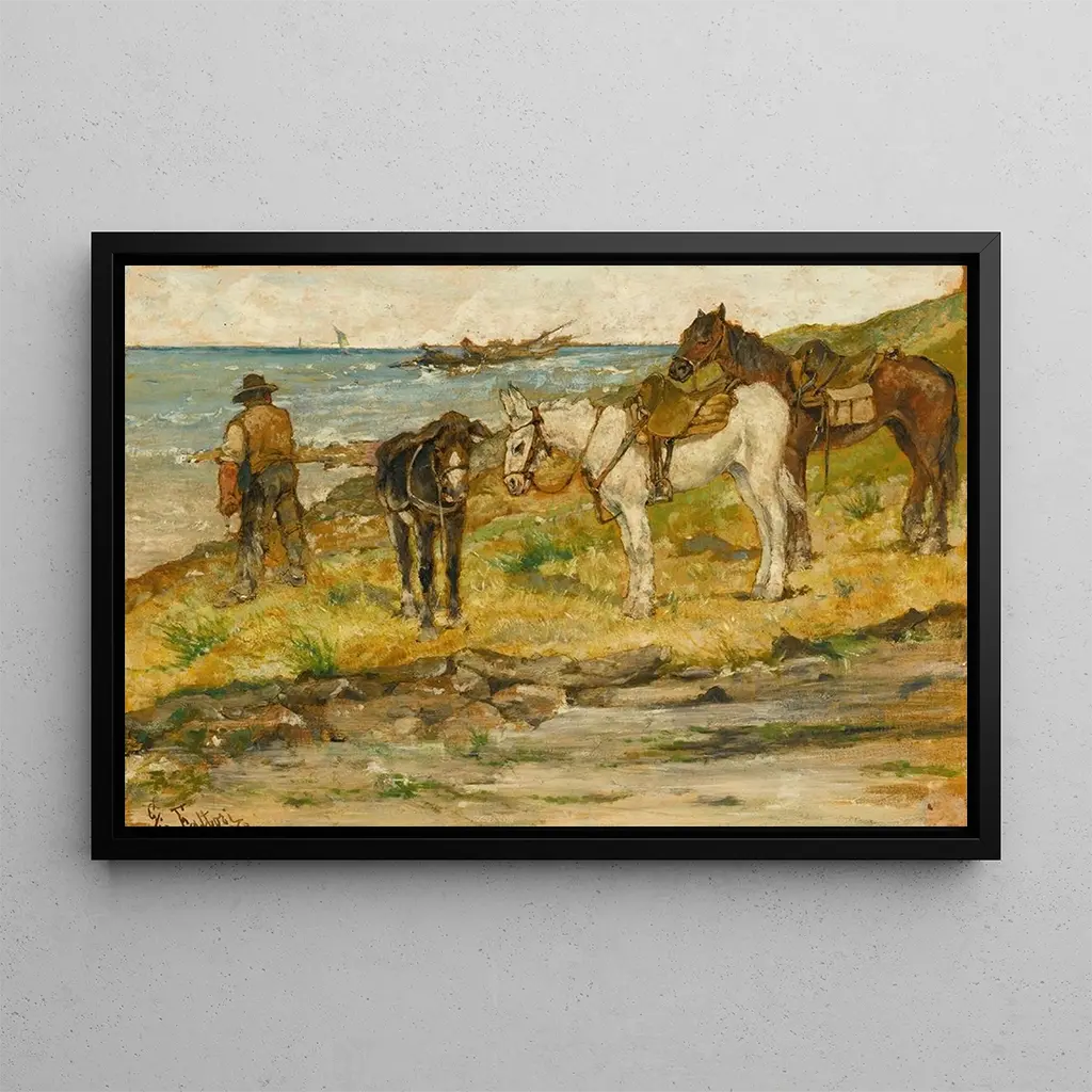 Paysage avec chevaux : une danse de vie et de mouvement Giovanni Fattori nous plonge dans un tableau vibrant de vie avec Paysage avec chevaux, où les animaux majestueux semblent s'animer sous nos yeux. Les couleurs chaudes et terreuses, mêlées à des touches de bleu et de vert, évoquent une scène bucolique où la nature et les chevaux cohabitent en parfaite harmonie. La technique impressionniste de Fattori, caractérisée par des coups de pinceau dynamiques, confère à l'œuvre une atmosphère de mouvement, presque palpable. Ce tableau invite à ressentir la liberté et la beauté de la vie à la campagne, où chaque détail est une célébration de la nature. Giovanni Fattori : un maître de l'impressionnisme italien Giovanni Fattori est une figure emblématique du mouvement impressionniste italien, actif au XIXe siècle. Sa carrière est marquée par une volonté de représenter la vie quotidienne et la nature avec une approche réaliste et expressive. Influencé par les paysages toscans et les scènes de la vie rurale, Fattori développe un style unique qui se distingue par sa capacité à capturer la lumière et le mouvement. En tant que membre du groupe des Macchiaioli, il contribue à l'évolution de l'art en Italie, en s'éloignant des conventions académiques pour explorer des thèmes plus contemporains et personnels. Une acquisition décorative aux multiples atouts La reproduction du tableau Paysage avec chevaux est un ajout parfait pour ceux qui souhaitent insuffler une touche d'énergie et de dynamisme à leur décoration intérieure. Que ce soit dans un salon, un bureau ou une chambre, cette toile apporte une ambiance vivante et chaleureuse. Sa qualité d'impression assure une fidélité remarquable aux couleurs et aux détails de l'œuvre originale, faisant de cette reproduction un véritable point focal dans n'importe quel espace. Choisir cette œuvre, c'est opter pour une pièce qui évoque la beauté de la nature et le mouvement, tout en enrichissant votre environnement d'une dimension artistique.