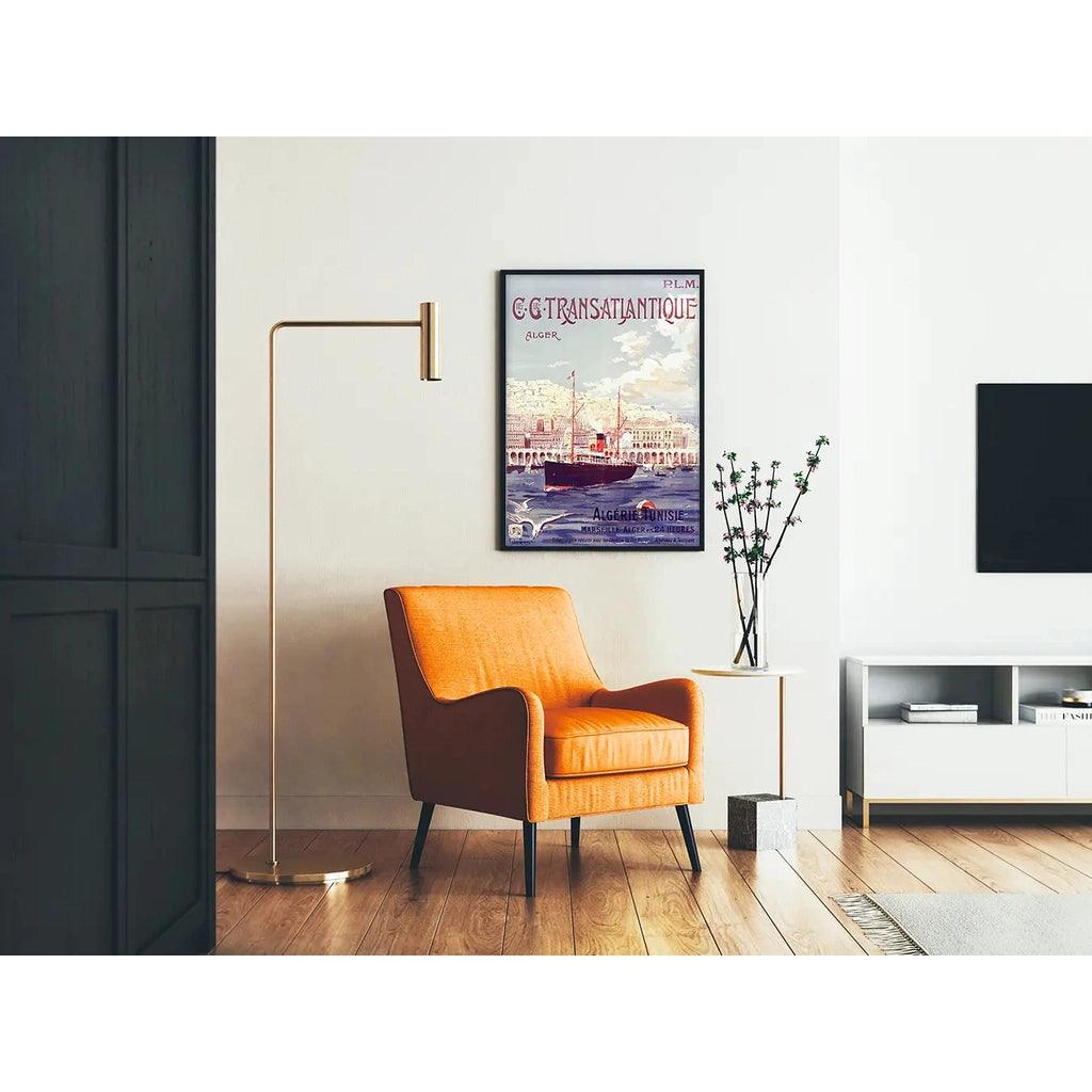 Voyagez dans le temps avec cette magnifique reproduction de l'affiche vintage de la Compagnie Générale Transatlantique, promouvant la traversée entre Marseille et Alger en 24 heures. Cette œuvre emblématique met en scène un paquebot élégant naviguant dans le port d’Alger, avec en arrière-plan la majestueuse architecture méditerranéenne et les collines baignées de lumière.
