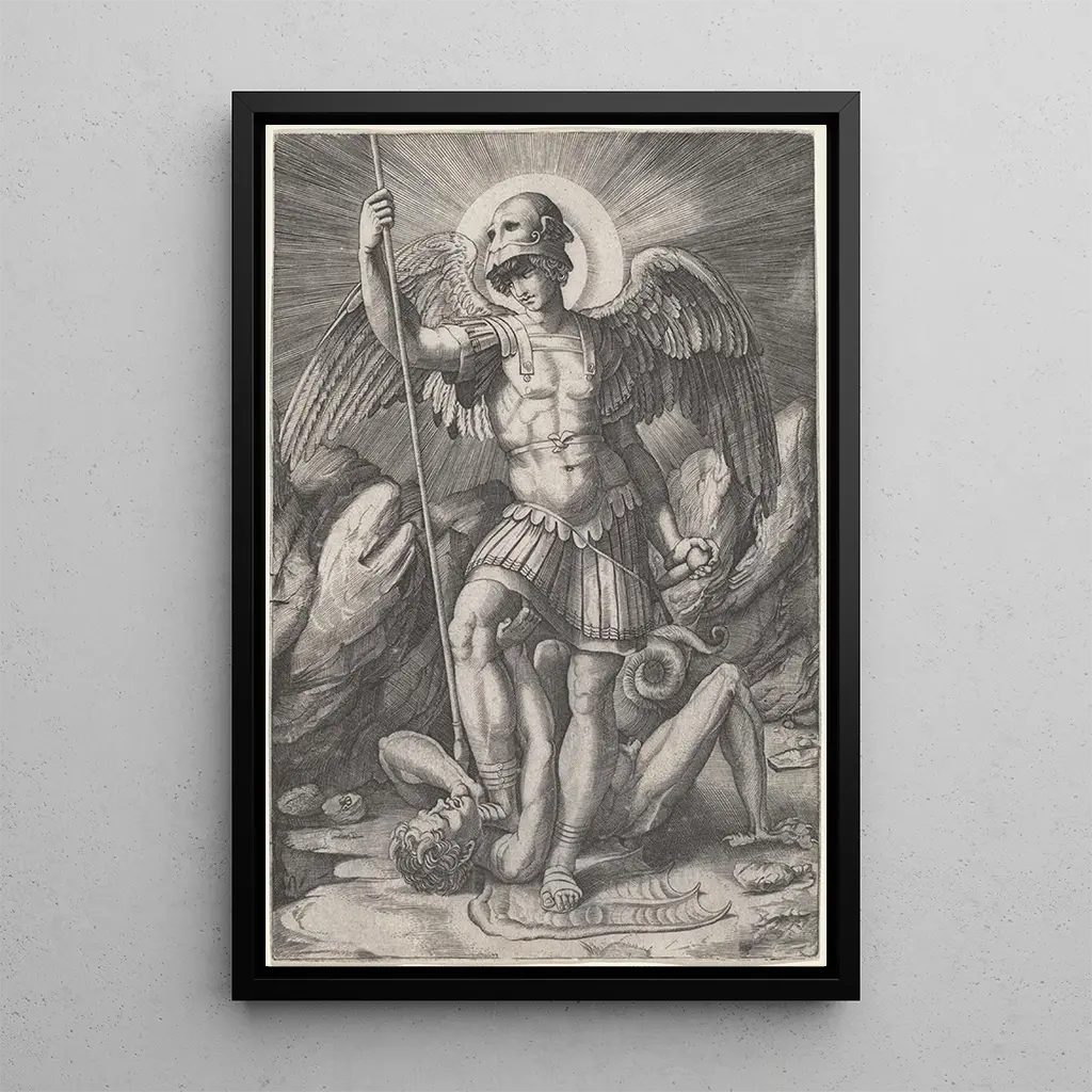 Dans cette œuvre saisissante, Marco Dente représente Saint Michel, l'archange guerrier, dans une posture dynamique et imposante. La composition est marquée par des couleurs vives et des contrastes puissants, mettant en valeur la force de ce personnage céleste. La technique de gravure utilisée par Dente permet de capturer les détails minutieux de l'armure et des ailes déployées de l'archange. L'atmosphère qui se dégage de cette toile est à la fois héroïque et spirituelle, invitant le spectateur à réfléchir sur le combat entre le bien et le mal. Cette reproduction du tableau est une véritable ode à la bravoure et à la foi.