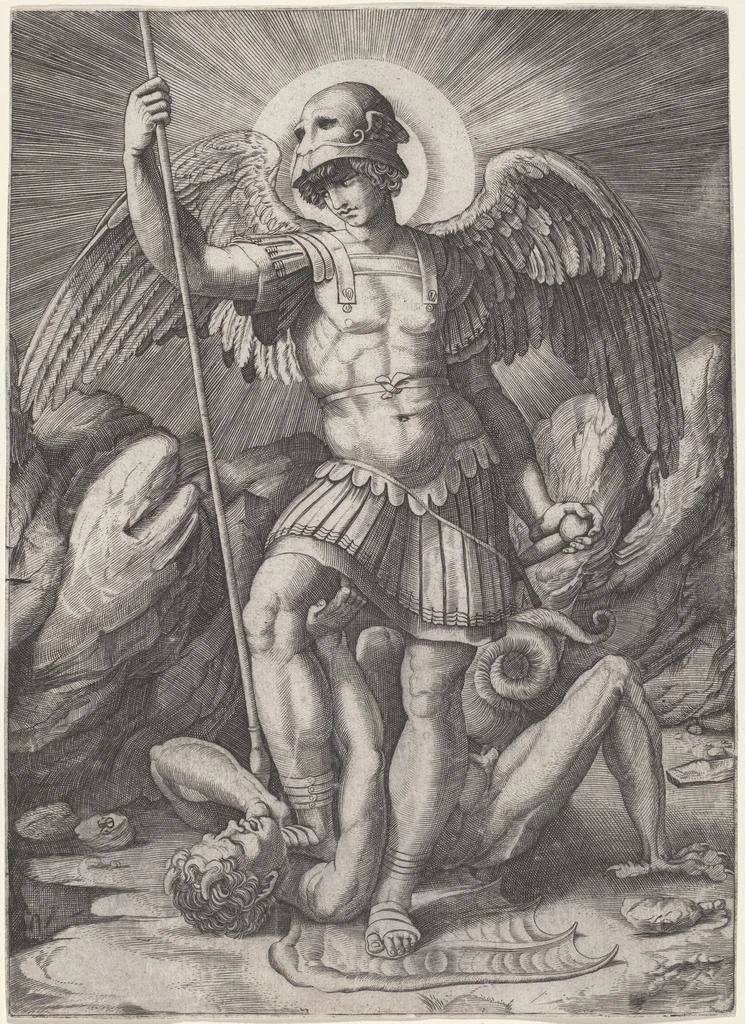Marco Dente, actif au début du XVIe siècle, est reconnu pour son talent exceptionnel dans le domaine de la gravure. Évoluant à une époque où la Renaissance italienne bat son plein, il s'inspire des grands maîtres de son temps, tout en développant un style personnel qui allie précision et expressivité. Dente a su capturer des scènes religieuses avec une profondeur émotionnelle, faisant de ses œuvres des références dans le domaine de l'art sacré. La représentation de Saint Michel illustre parfaitement son habileté à marier technique et narrativité, renforçant ainsi son importance dans l'histoire de l'art.