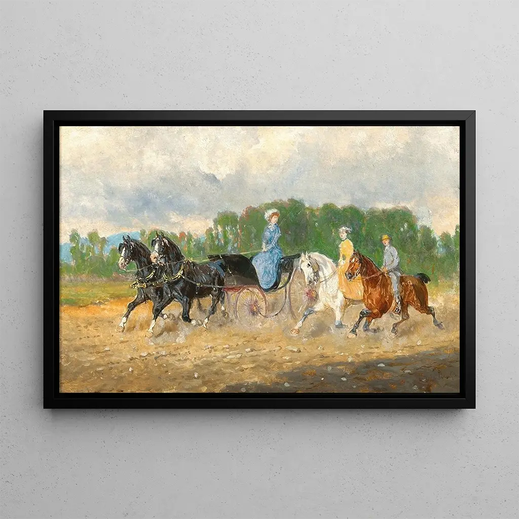 Passeggiata in auto: una fuga bucolica nel cuore della natura In "Passeggiata in auto", Alexander von Bensa ci trasporta in una scena idilliaca dove natura e umanità coesistono armoniosamente. La composizione, ricca di dettagli, mette in risalto un paesaggio verdeggiante, bagnato da una luce soffusa. I colori, che vanno dal verde brillante alle tonalità terrose, creano un'atmosfera tranquilla e accogliente. La tecnica dell'artista, che mescola abilmente il realismo a un tocco impressionista, invita lo spettatore a percepire la serenità di questo momento sospeso. Ogni elemento, dal veicolo agli alberi maestosi, sembra raccontare una storia, quella di una fuga immersa nella natura. Alexander von Bensa: un maestro del paesaggio romantico Alexander von Bensa, attivo nel XIX secolo, è riconosciuto per i suoi paesaggi che catturano la bellezza della natura e la vita quotidiana. Influenzato dal movimento romantico, cerca di esprimere emozioni attraverso le sue opere, ispirandosi ai grandi maestri della sua epoca. La sua capacità di giocare con la luce e le ombre gli permette di creare atmosfere uniche, che lo rendono un artista imprescindibile del paesaggio romantico. Bensa ha saputo lasciare il segno nel suo tempo con le sue rappresentazioni della vita rurale, offrendo uno sguardo nostalgico su un mondo in piena trasformazione. Una riproduzione decorativa con molteplici vantaggi La riproduzione di "Passeggiata in auto" costituisce una scelta decorativa ideale per abbellire il tuo soggiorno, ufficio o camera da letto. La qualità di stampa e la fedeltà ai dettagli dell'opera originale ne fanno un quadro affascinante che cattura lo sguardo. Integrando questa tela nella tua decorazione, porti un tocco di eleganza e serenità nel tuo spazio. Il suo fascino estetico e la capacità di evocare emozioni ne fanno un elemento centrale del tuo interno, creando un'atmosfera calda e accogliente.