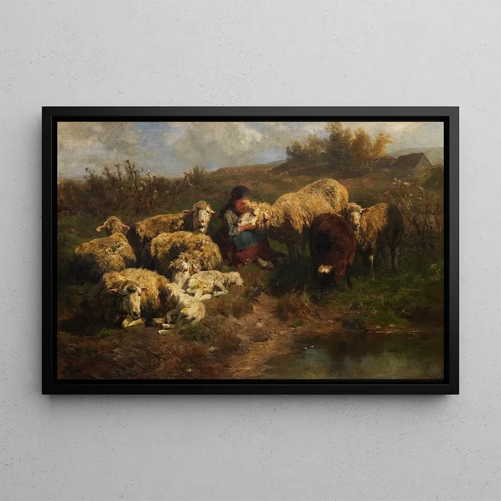 In "Piccola pastorella con pecore", Anton Braith ci immerge in un universo pastorale dove regna la serenità. La composizione, attentamente orchestrata, mette in evidenza una giovane pastorella circondata dalle sue pecore, catturando la bellezza semplice della vita rurale. I colori morbidi e naturali, che vanno dai verdi rilassanti ai marroni caldi, creano un'atmosfera di tranquillità. La tecnica di Braith, che mescola realismo e impressionismo, dà vita a ogni dettaglio, dai tratti delicati del volto della pastorella alle texture del mantello delle pecore. Quest'opera invita alla contemplazione e a un'evasione verso paesaggi idealizzati.