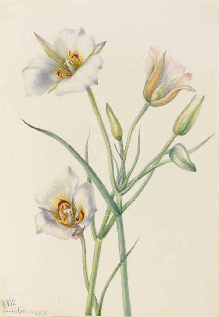 Mary Vaux Walcott, attiva all'inizio del XX secolo, è riconosciuta per i suoi contributi all'arte botanica americana. Influenzata dai movimenti naturalisti e dall'importanza crescente della conservazione della natura, ha saputo unire precisione scientifica e sensibilità artistica. Le sue opere, tra cui la stampa d'arte di Ségo Lily Calochortus nuttallii, testimoniano un'epoca in cui la natura veniva celebrata attraverso l'arte. Walcott ha anche partecipato a spedizioni nell'Ovest americano, permettendole di catturare specie rare e sensibilizzare il pubblico sulla bellezza della flora locale.