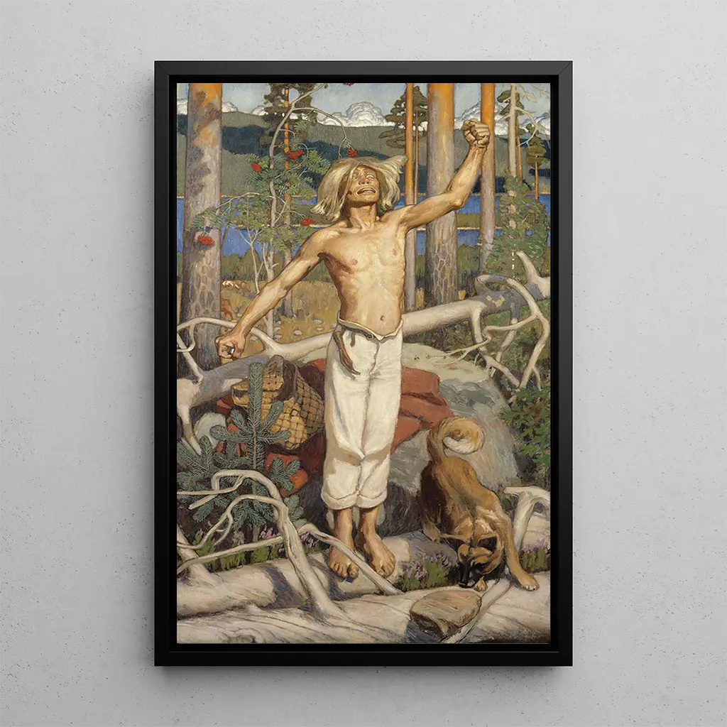 Kullervo maledice, stampa d'arte emblematica di Akseli Gallen-Kallela, immerge lo spettatore in un universo di disperazione e lotta interiore. La composizione dinamica, in cui il personaggio centrale si erge con intensità, è accentuata da colori scuri e tocchi di rosso, simbolo di rabbia e dolore. La tecnica di Gallen-Kallela, che combina realismo e simbolismo, crea un'atmosfera toccante, in cui ogni dettaglio racconta una storia. Questa stampa d'arte, ispirata alla mitologia finlandese, evoca temi universali come la vendetta e la fatalità, invitando a una riflessione profonda sulla condizione umana.