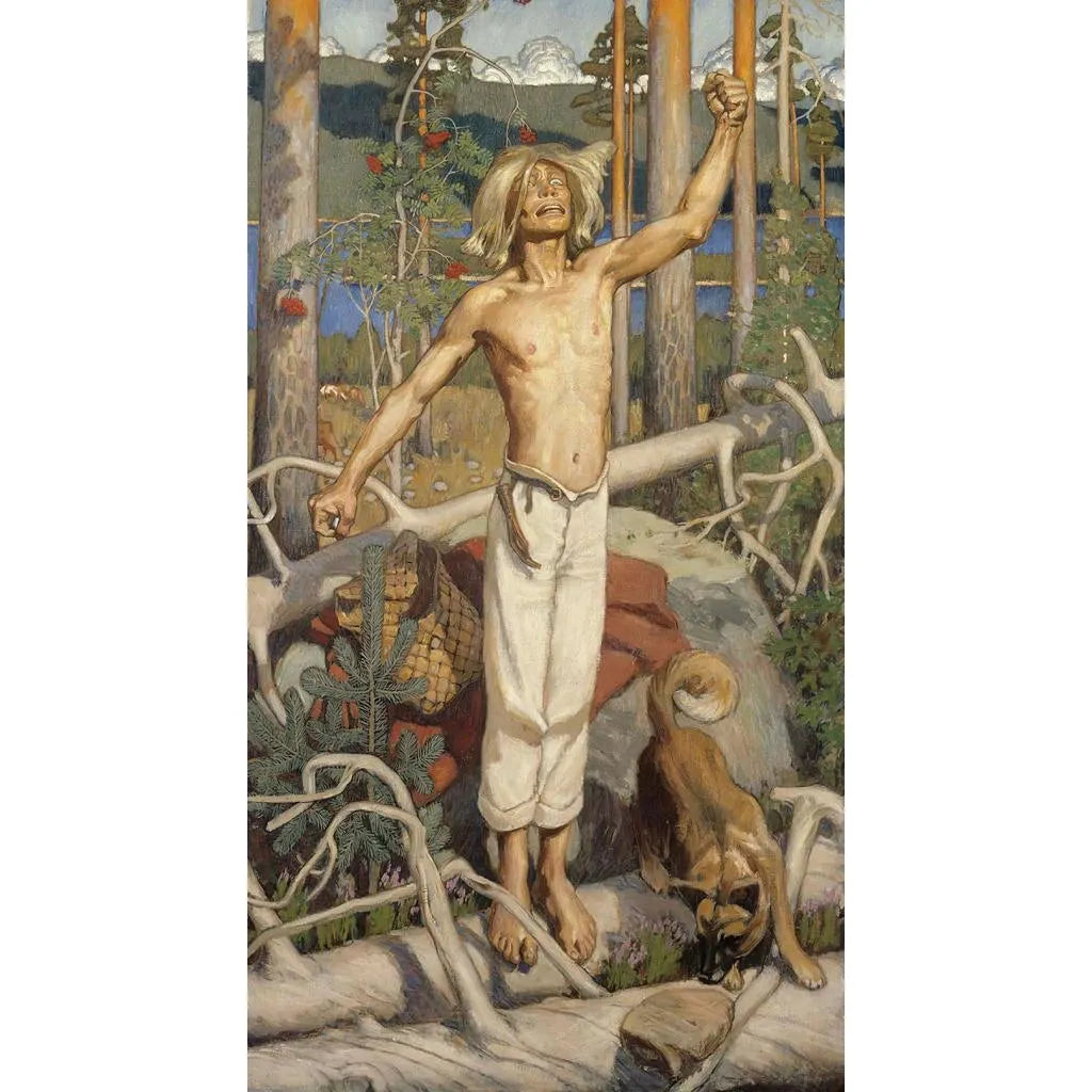 Akseli Gallen-Kallela, nato nel 1865, è uno degli artisti più influenti della Finlandia, riconosciuto per il suo ruolo nello sviluppo della stampa d'arte simbolista nordica. La sua carriera, segnata da viaggi in Francia e in Italia, gli ha permesso di integrare diverse influenze artistiche pur rimanendo radicato nelle sue radici finlandesi. Gallen-Kallela si ispira alle epiche nazionali, in particolare al Kalevala, e utilizza la sua arte per esplorare temi folkloristici e mitologici. La sua opera, Kullervo maledice, è un esempio perfetto della sua capacità di fondere storia e leggenda, trasmettendo emozioni intense attraverso forme e colori audaci.