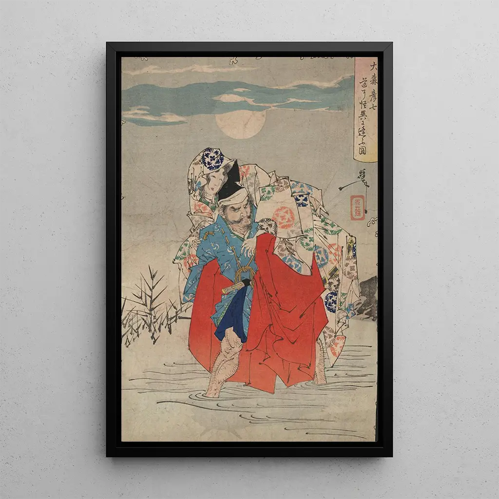 La stampa d'arte di Tsukioka Yoshitoshi, intitolata "Omori Hikoshichi", ci immerge in un universo dove le ombre e le luci si intrecciano con una delicatezza poetica. Quest'opera, emblematica dell'estampe giapponese, si distingue per i suoi colori vivaci e i dettagli minuziosi. Yoshitoshi, maestro della tecnica ukiyo-e, utilizza sfumature sottili per creare un'atmosfera allo stesso tempo mistica e affascinante. Il personaggio centrale, vestito in modo tradizionale, sembra emergere da un sogno, mentre lo sfondo evoca un paesaggio sia realistico che fantastico. Questa tela invita alla contemplazione, rivelando storie nascoste in ogni colpo di pennello.