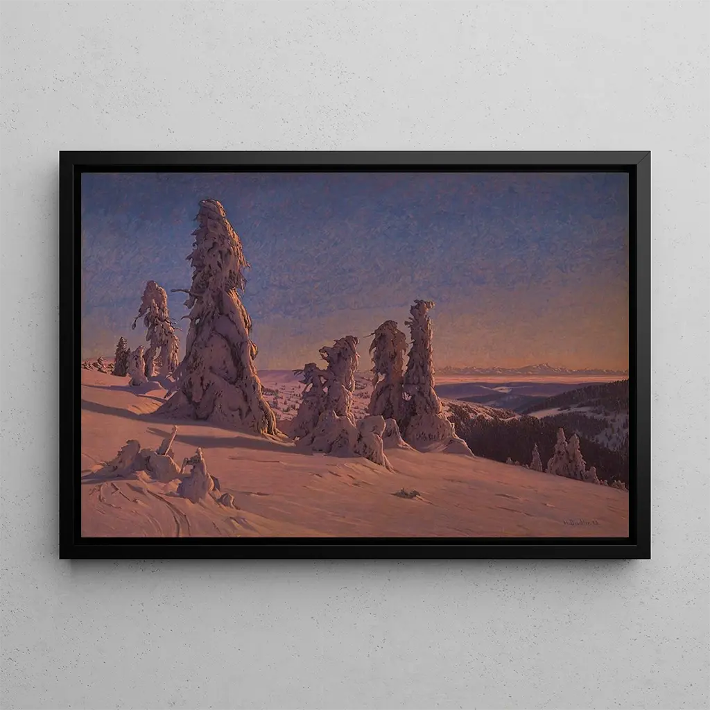 Le tableau "Sapin gelé sur le Feldberg" évoque une atmosphère paisible et silencieuse, où la nature se drape d'un manteau de neige scintillante. Les sapins, majestueux et recouverts de givre, se dressent fièrement dans un paysage hivernal, tandis que le ciel d'un bleu pâle contraste délicatement avec le blanc éclatant de la neige. La technique utilisée, probablement à l'huile, permet de capturer la texture du givre et la douceur de la lumière, créant ainsi une sensation de calme et de tranquillité. Cette œuvre invite à la contemplation, à la rêverie, et à l'évasion vers des contrées enneigées.
