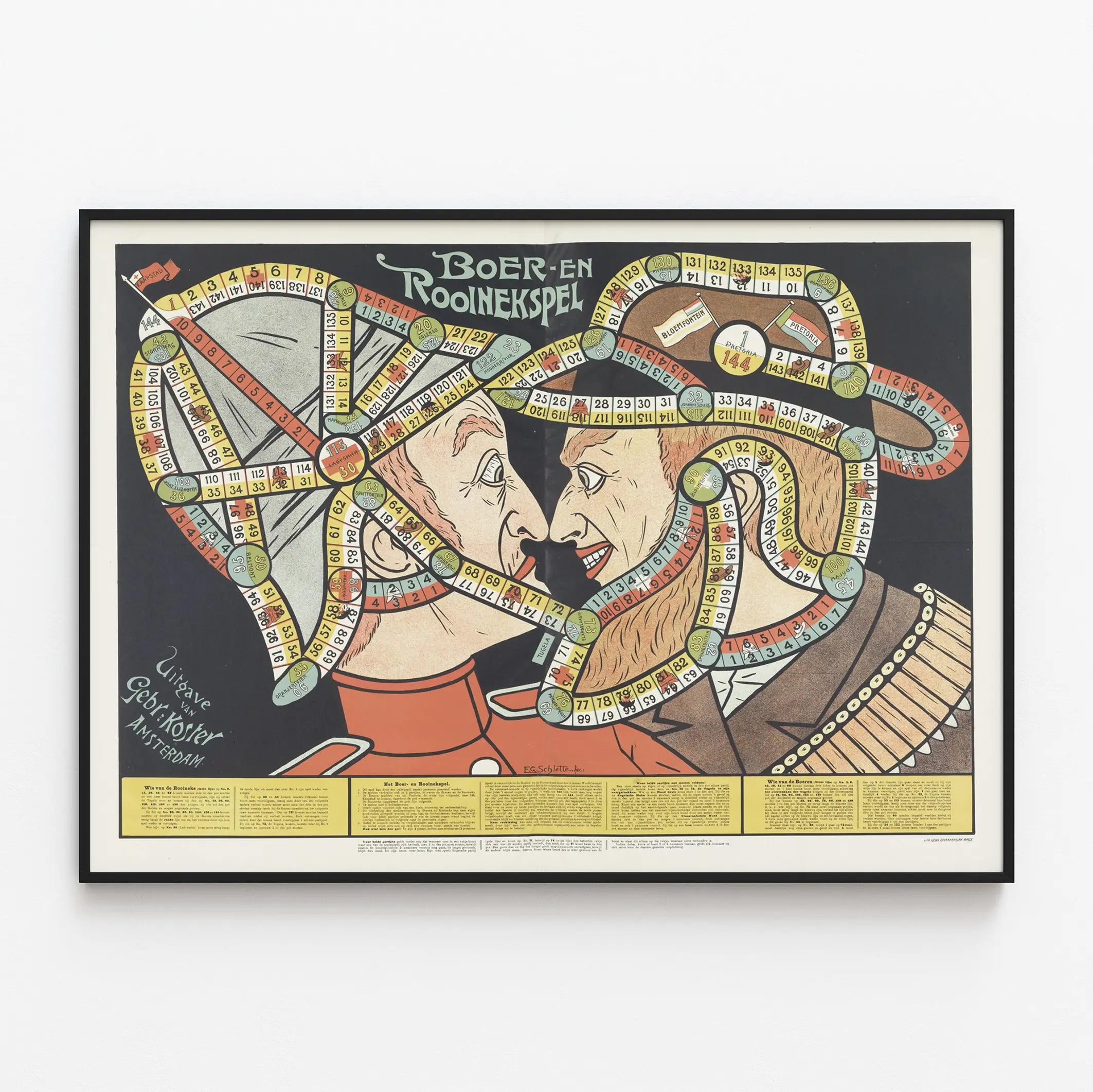 Cette affiche vintage représente un jeu de société intitulé "Boer en Rooiniekspel", un véritable élément de décoration murale qui invite au voyage dans le temps. L'affiche présente deux portraits stylisés se faisant face, l'un à gauche portant un chapeau militaire et l'autre à droite avec une barbe fournie, tous deux entourés d'un parcours de jeu en spirale composé de cases numérotées de différentes couleurs (jaune, rouge, bleu et vert). Chaque case semble indiquer une étape ou un événement lié au jeu, avec quelques symboles et petits dessins en lien avec le thème. Ce poster offre un mélange unique d'illustration graphique et de ludisme qui s'intègre parfaitement dans un espace dédié à la décoration murale originale et historique.