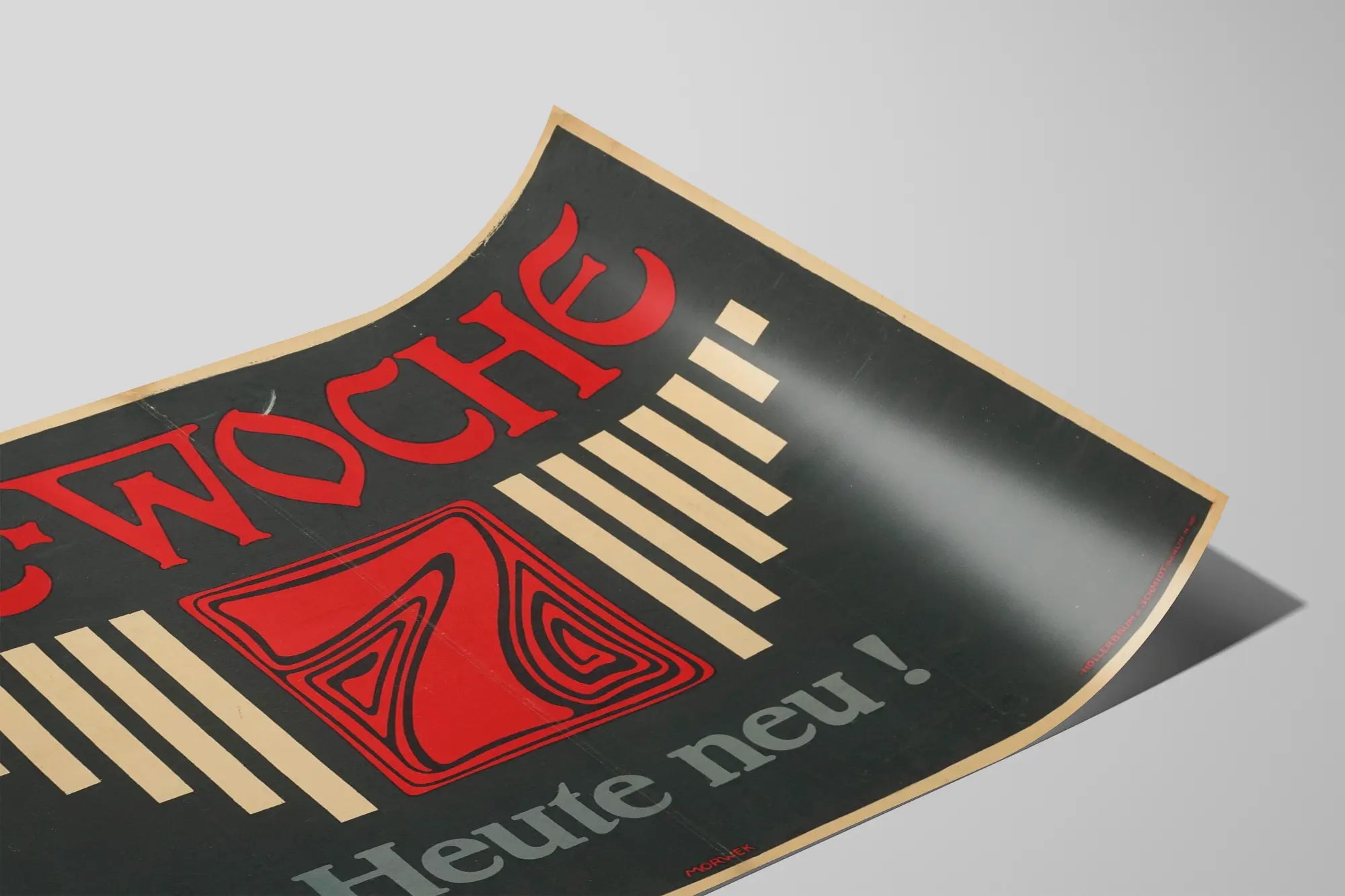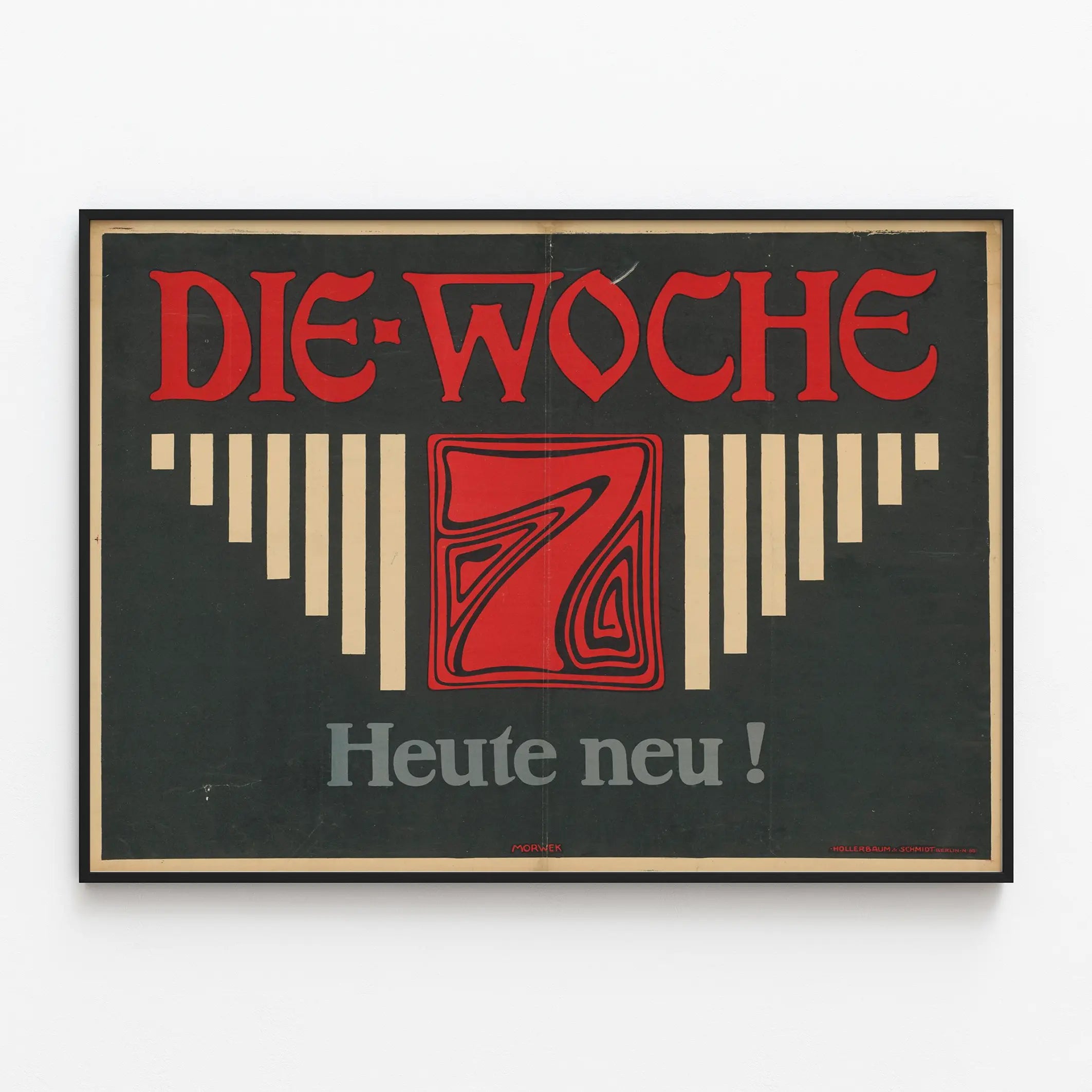 Cette affiche vintage intitulée "Die Woche" se distingue par son design fort et graphique, caractéristique du style Art déco. Elle présente un fond noir profond mettant en valeur un grand titre rouge vif "DIE WOCHE" situé en haut de l'affiche. Au centre, un carré rouge orné d'un motif stylisé en noir attire immédiatement le regard. Ce carré encadre un chiffre 7, également dessiné dans un style géométrique et abstrait, typique des premières décennies du 20e siècle. Le bas de l'affiche affiche en lettres grises la phrase "Heute neu !", ce qui signifie "Aujourd'hui nouveau !" en allemand. Cette composition est équilibrée avec des formes rectangulaires verticales et symétriques dans un ton beige clair, qui encadrent le carré central et amplifient l'effet de profondeur. Signée "Morwek" en bas au centre, cette affiche témoigne d'une esthétique minimaliste et moderne pour son époque. C'est un excellent choix de décoration murale si vous souhaitez apporter une touche rétro graphique à votre intérieur. Elle peut être utilisée comme poster dans un salon, une bibliothèque ou un bureau pour diffuser un style vintage et sophistiqué. Par ses couleurs contrastées et son design épuré, ce tableau mural s'intègre parfaitement dans une décoration d'intérieur contemporaine ou industrielle. Cette affiche ancienne est idéale pour les amateurs d'art graphique et de typographie historique. En choisissant cette affiche "Die Woche", vous apportez un objet d'art mural original qui captera l'attention tout en évoquant une ambiance culturelle européenne du début du 20e siècle. Cette décoration murale en papier se prête à une mise en valeur sous cadre noir ou bois, pour habiller vos murs d'une oeuvre intemporelle et pleine de caractère.