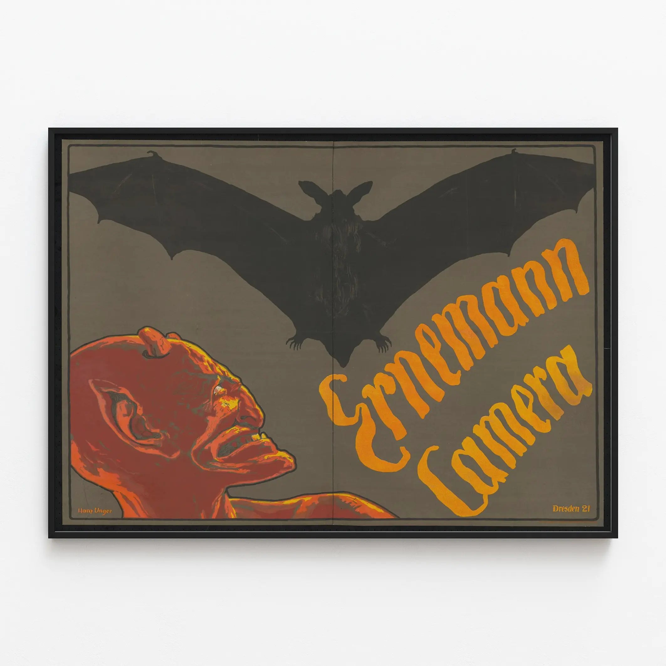 Affiche vintage Ernemann Camera avec démon et chauve-souris