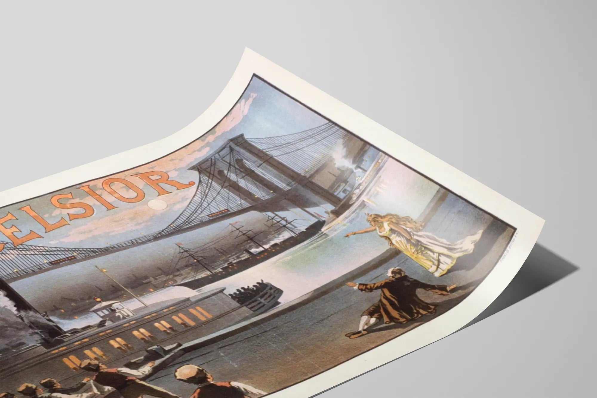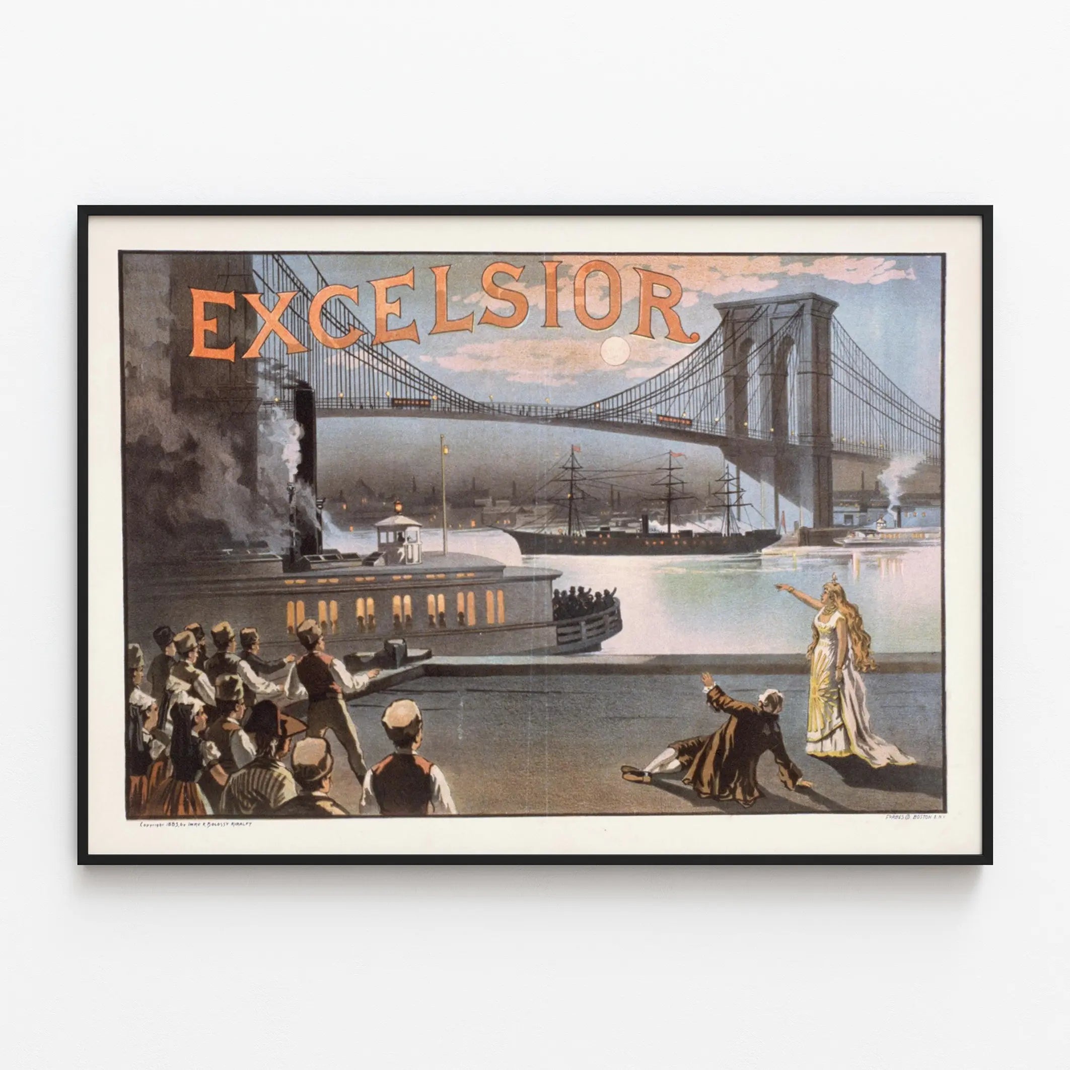 Cette affiche vintage "Excelsior" est une pièce unique idéales pour enrichir votre décoration murale avec une touche d'histoire et d'élégance. Le poster dépeint une scène portuaire traditionnelle où un groupe de personnes assiste à l'arrivée ou au départ d'un bateau à vapeur sous un pont suspendu monumental, probablement inspiré d'une architecture urbaine américaine du XIXe siècle. La composition met en avant un contraste saisissant entre le dynamisme humain et la majesté des infrastructures maritimes, offrant un intérêt visuel important pour toute pièce de vie, bureau ou espace d'accueil. Le motif central, avec ses personnages habillés en costumes d'époque et les détails précis des bateaux et du pont, confère une atmosphère nostalgique et romantique. Cette décoration murale s'adresse aux amateurs de posters historiques, des passionnés d'art rétro et des collectionneurs qui recherchent des affiches illustratives à forte personnalité. La typographie "Excelsior" placée en haut de l'affiche souligne le caractère affirmé de cette œuvre, ajoutant un élément graphique très esthétique qui dynamise l'ensemble. Ce tableau mural permet de recréer une ambiance vintage tout en valorisant des éléments de design urbain et maritime classiques. Parfait pour une mise en valeur dans un intérieur au style industriel, classique ou même scandinave, ce poster s'intègre harmonieusement dans différents décors, apportant un point focal attractif et une histoire visuelle captivante. L'utilisation du poster comme élément de décoration murale ajoute de la profondeur à votre espace, mélangeant culture, histoire et esthétique. En choisissant ce poster imprimé, vous optez pour un objet décoratif qui transcende le simple ornement pour devenir un témoin graphique d'un passé portuaire et industriel. Que ce soit pour un salon, une bibliothèque, un bureau ou une salle d'attente, cette affiche vintage "Excelsior" est un choix élégant qui invite au voyage et à la contemplation. Elle est également idéale pour des projets de décoration à thème ou pour des espaces dédiés à l'art et à l'histoire. En résumé, ce poster illustré est une invitation à redécouvrir la beauté des scènes maritimes d'antan et à enrichir vos murs d'une œuvre au charme intemporel.
