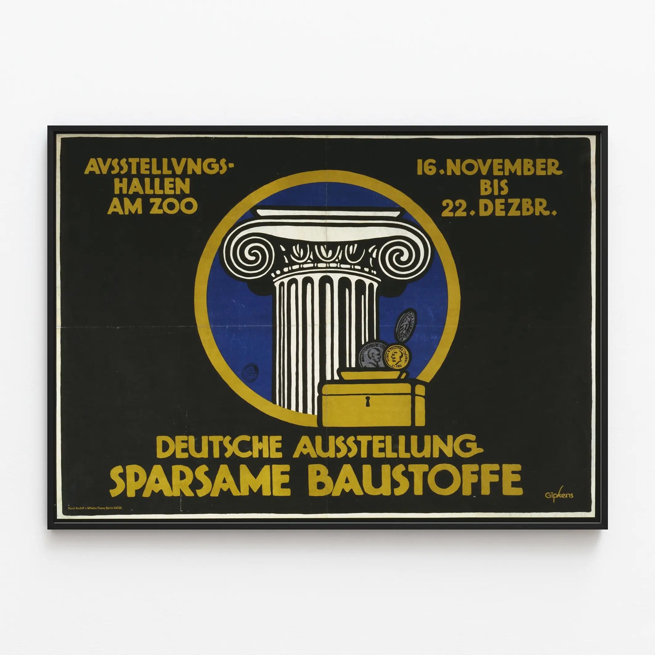 Cette affiche vintage unique met en avant l'Exposition allemande des matériaux économes (« Deutsche Ausstellung Sparsame Baustoffe »), organisée dans les halls d'exposition près du zoo, du 16 novembre au 22 décembre. Le design graphique utilise un style épuré avec des couleurs fortes : un fond noir profond, un cercle bleu entouré d'une bordure dorée, mettant en valeur une colonne architecturale blanche de style ionique, emblématique de la stabilité et de l'ingénierie classique. Au premier plan, une caisse-forte dorée accueillant des pièces de monnaie symbolise l'idée d'économie et de valeur dans le choix des matériaux de construction. Cette affiche allie esthétique rétro et message fonctionnel, idéale pour les amateurs de décorations murales historiques et industrielles. Utiliser cette affiche comme décoration murale confère à votre espace une touche d'authenticité et de style vintage urbain. Elle s'adapte parfaitement à un intérieur moderne ou classique, apportant une atmosphère de sophistication et d'histoire liée aux innovations en construction durable et aux économies de matériaux. Que ce soit en poster ou en reproduction encadrée, ce tableau mural séduira les passionnés d'architecture, d'histoire industrielle et de design des années passées. Le contraste entre le noir profond et les éléments graphiques dorés et blancs crée un impact visuel fort, idéal pour habiller un mur dans un bureau, un salon ou une salle d'exposition. Cette pièce déco véhicule également un message éco-responsable à travers le thème de l'efficacité des matériaux, en accord avec les tendances actuelles de décoration visant à inspirer des modes de vie plus durables. Apportez un caractère unique et un brin d'érudition à votre décoration murale grâce à cette affiche historique rare.