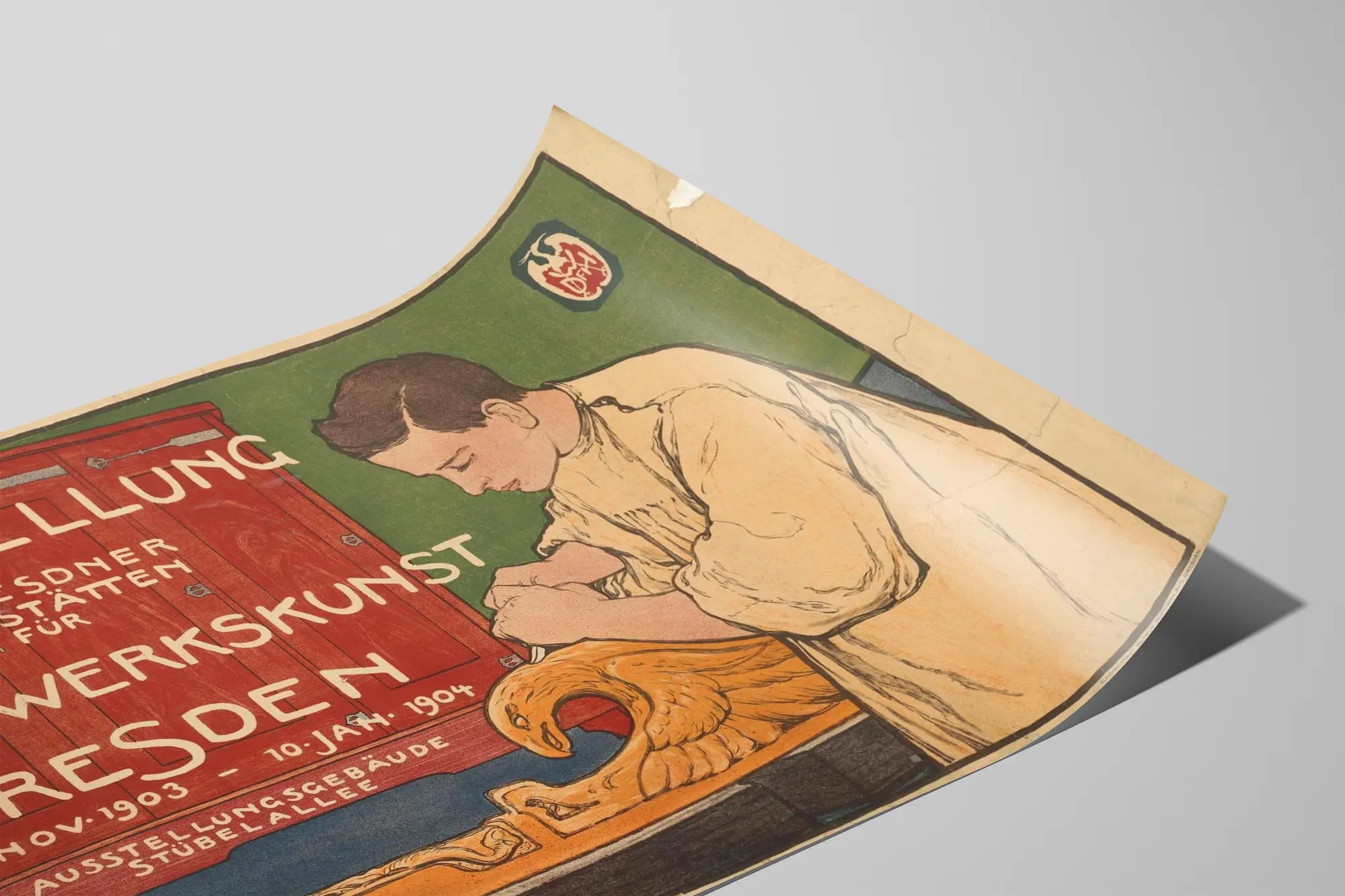 Cette affiche vintage est une représentation unique d'une exposition d'artisanat qui s'est tenue à Dresde au début du XXe siècle, du 14 novembre 1903 au 10 janvier 1904. Elle illustre avec talent l'univers de la décoration murale d'époque, mêlant illustration et typographie dans un style marqué par l'Art nouveau. Le poster met en scène un jeune artisan en train de sculpter un motif d'aigle en bois, soulignant l'importance du travail manuel et du savoir-faire traditionnel. Le fond de l'affiche joue avec des blocs de couleurs vives, notamment le vert, le rouge et l’ocre, qui valorisent les détails du meuble et l'attitude concentrée du sculpteur. Ce tableau mural, par son esthétique durable et son caractère authentique, est idéal pour apporter une touche d'histoire et d'élégance dans une décoration d'intérieur dédiée à l'artisanat ou au design vintage. La typographie singulière, avec ses lettres calligraphiées à la main, complète le charme décoratif de cet affichage ancien, prisé des amateurs de posters d'exposition. Cette pièce décorative murale raconte une époque où la tradition et la précision du travail artisanal étaient célébrées à travers des événements culturels, ce qui en fait un objet précieux pour les passionnés de décoration murale et de l'histoire de l'artisanat. Ce poster se distingue par son style graphique ancien ainsi que par son format qui convient parfaitement à une mise en valeur murale contemporaine dans un salon, un bureau ou une galerie d'art. Choisir cette affiche pour votre intérieur, c'est inviter un morceau d'histoire de l'art et du travail manuel, tout en donnant vie à vos murs par une décoration empreinte d'authenticité et d'élégance. Un élément déco incontournable pour les amateurs de posters originaux et les passionnés de décoration murale historique.