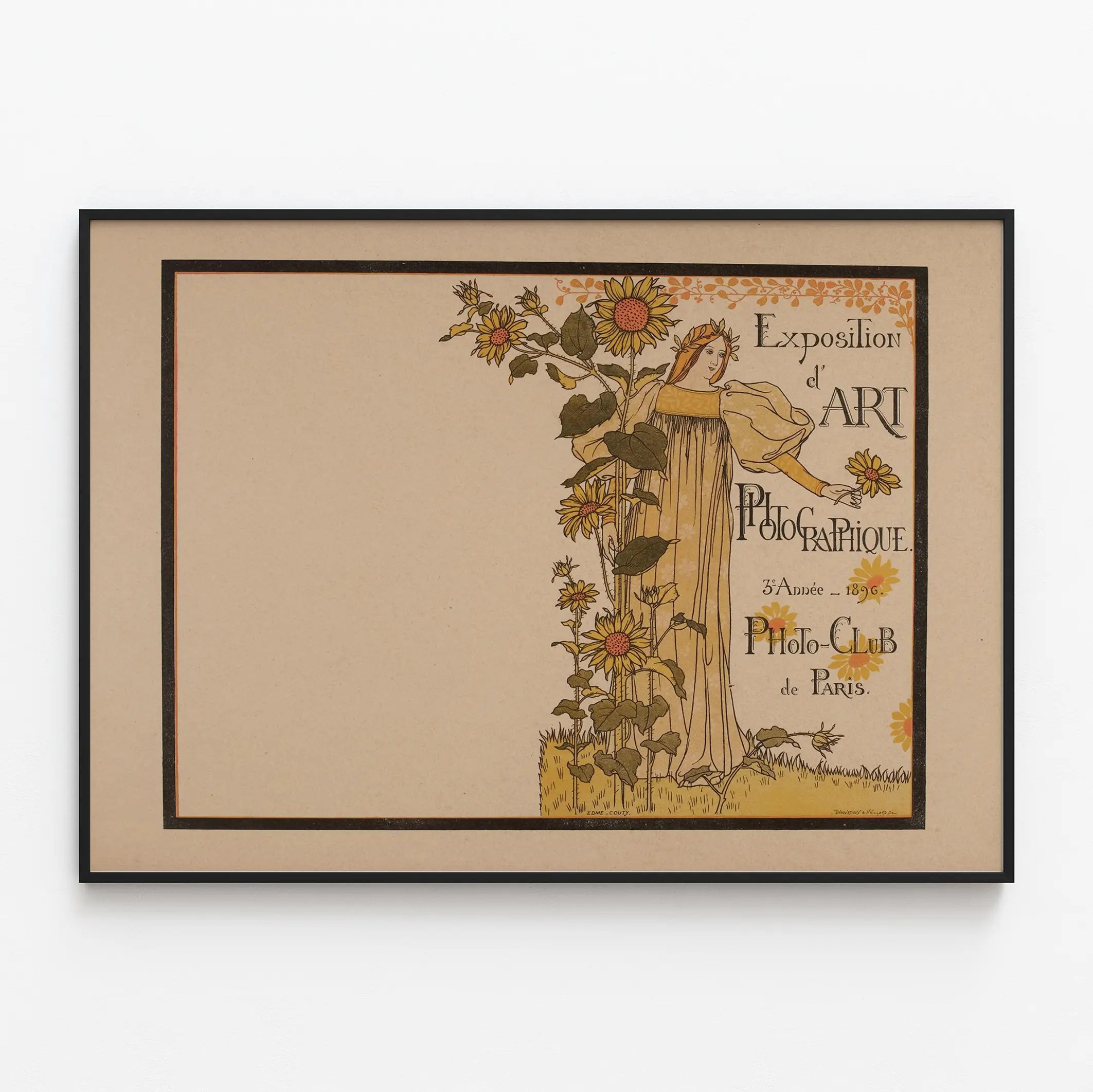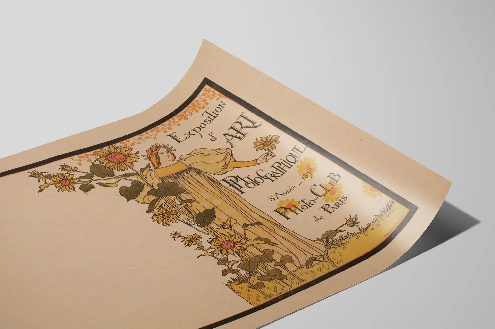 Découvrez cette affiche vintage emblématique de l'Exposition d'Art Photographique organisée par le Photo-Club de Paris lors de sa 3e année en 1896. Ce poster ancien allie esthétique Art Nouveau et design raffiné, avec une illustration délicate représentant une figure féminine élégante entourée de tournesols, symbole de lumière et de créativité. Parfaite pour une décoration murale originale, cette affiche apporte une touche historique et artistique à tout intérieur, qu'il soit classique ou contemporain.