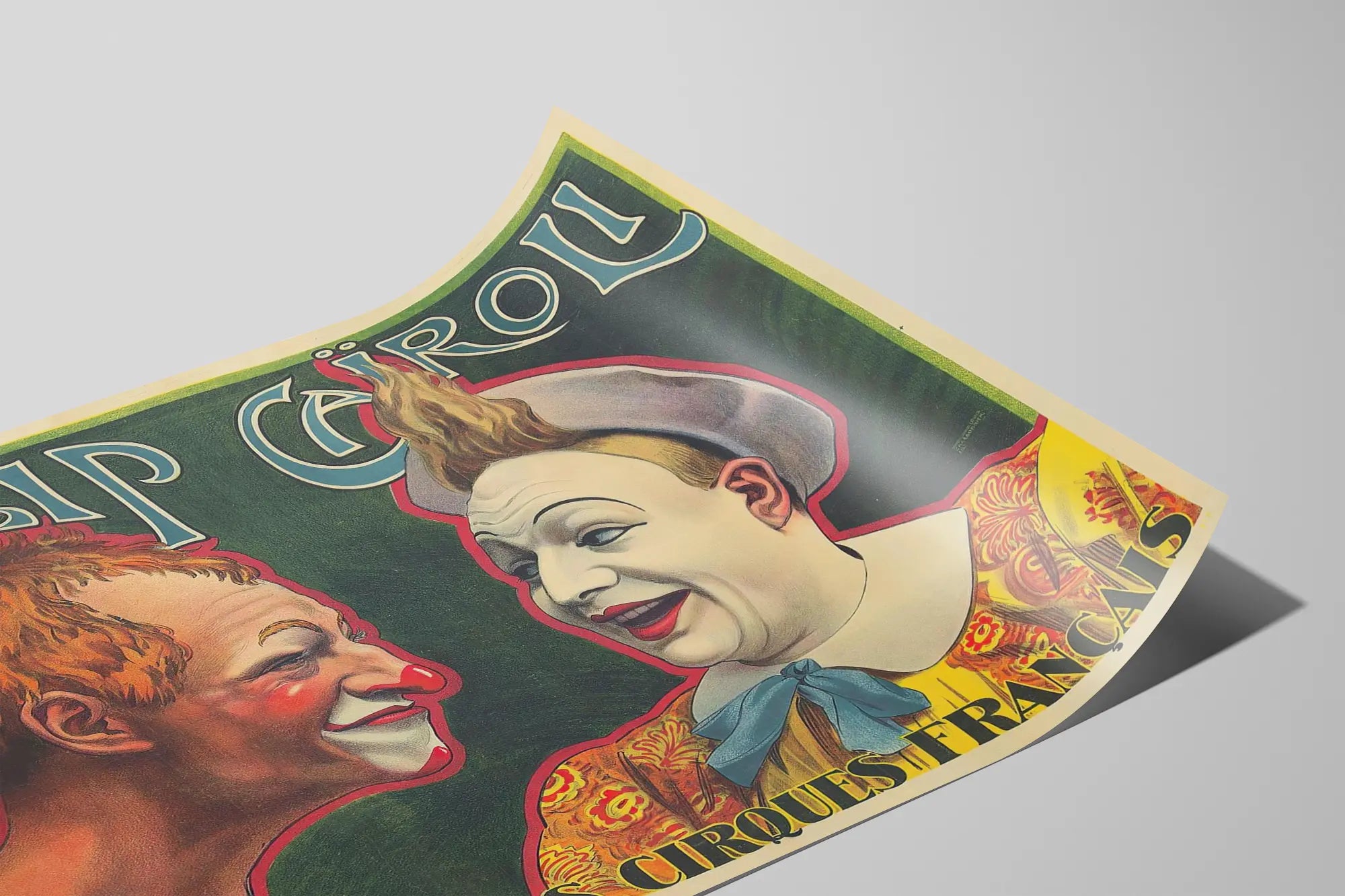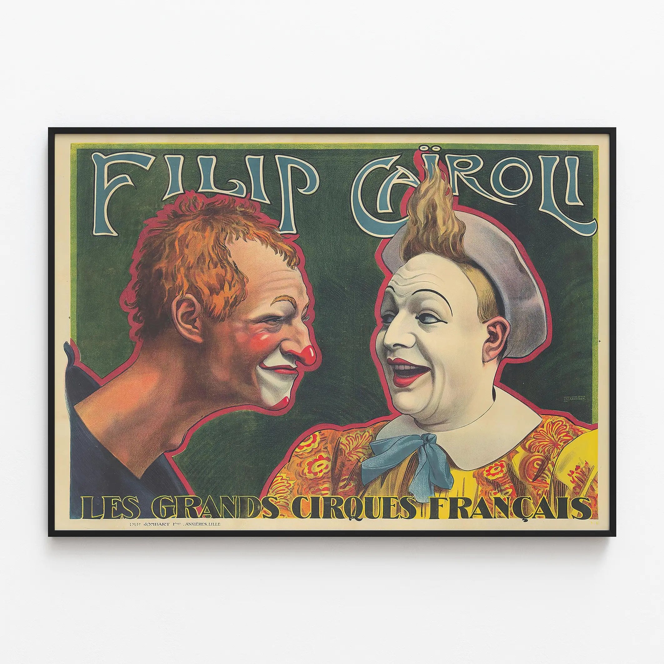 Cette affiche vintage met en avant Filip Cairoli, un artiste de cirque emblématique, avec un design typique de l'art publicitaire des grands cirques français. Ce poster de décoration murale illustre deux clowns, dont l'un affiche un maquillage traditionnel avec un nez rouge et des traits exagérés, tandis que l'autre porte un costume coloré orné d'un grand nœud bleu et d'un chapeau. Le fond vert profond met parfaitement en valeur les détails des visages et la richesse des couleurs utilisées, notamment les tons chauds de rouge, d'orange et de jaune qui captivent le regard. Le graphisme de l'affiche présente une typographie élégante et artistique, où le nom "Filip Cairoli" est inscrit en haut dans une calligraphie originale, renforçant l'esprit authentique et traditionnel du cirque. En bas de l'affiche, l'inscription "Les Grands Cirques Français" évoque la troupe et l'univers festif et magique du cirque, idéal pour une décoration murale pleine de caractère. Ce poster est un choix parfait pour les amateurs d'art rétro et de décoration vintage, apportant une touche d'histoire et de gaieté à tout intérieur. Il s'intègre aisément dans un salon, une salle de jeux ou un espace créatif, donnant vie aux murs avec une ambiance joyeuse et colorée. L'affiche vintage Filip Cairoli est une pièce de collection qui combine esthétique et culture populaire, renforçant toute décoration murale par son charme unique et intemporel.