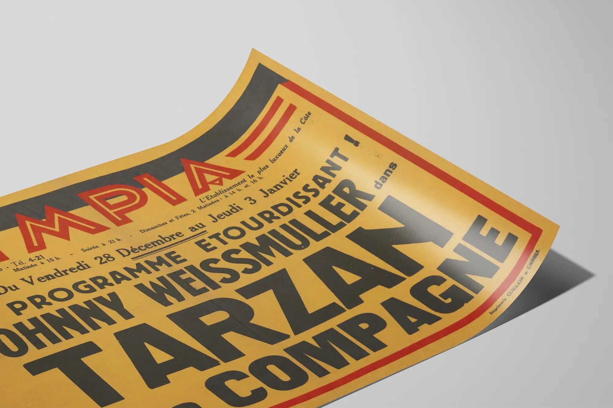 Découvrez cette affiche vintage exceptionnelle pour la décoration murale, promouvant la projection du film culte "Tarzan et sa Compagne" avec Johnny Weissmuller. Ce poster de cinéma classique aux couleurs jaunes et rouges vives est un incontournable pour les amateurs de décoration rétro et les passionnés de l'âge d'or hollywoodien. Parfait pour donner une touche authentique et nostalgique à tout intérieur, ce tableau affiche un design typographique remarquable mettant en avant le nom de l'acteur principal et la période de projection du film, soulignant l'ambiance des salles de cinéma de l'époque. L'affiche comporte également des détails historiques liés à sa présentation à l'établissement de l'Olympia à Cannes, ajouter une dimension culturelle à votre décoration murale. Idéale pour être encadrée ou simplement affichée, cette pièce unique invite à plonger dans l'univers mythique de Tarzan tout en valorisant le charme du vintage. Elle s'intègre parfaitement dans un salon, une chambre ou une salle de loisirs, complétant un style décoratif inspiré du cinéma ancien ou des affiches publicitaires d'autrefois. Apportez une ambiance rétro et éclatante à vos murs avec ce poster emblématique qui mêle art et cinéma, idéal pour embellir un espace personnel ou professionnel. Cette affiche est une véritable déclaration pour ceux qui aiment le cinéma classique avec une touche de design graphique remarquable.
