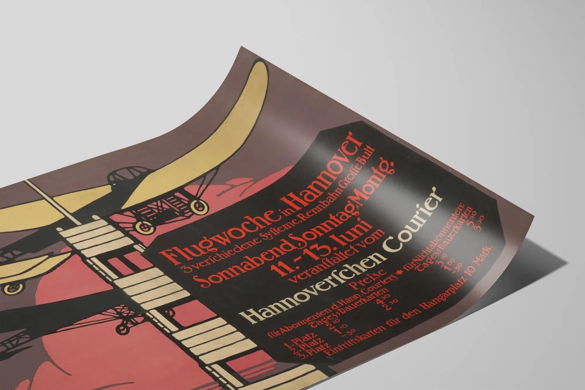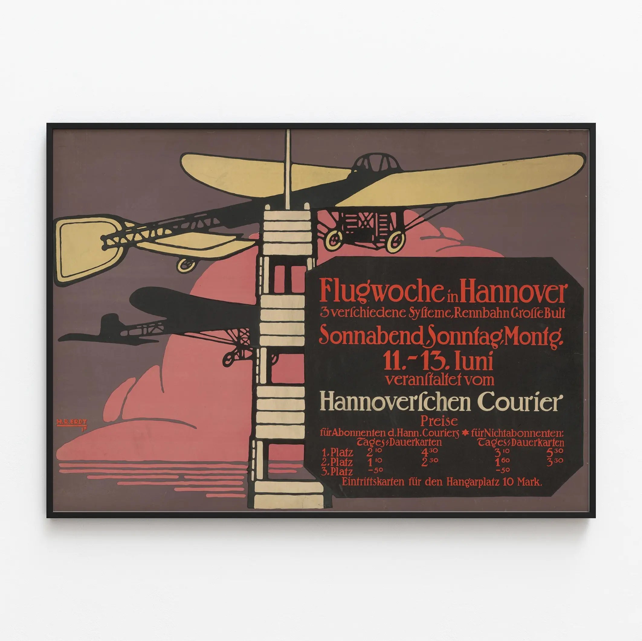 Découvrez cette affiche vintage illustrant la Flugwoche à Hanovre, un événement d'aviation mettant en avant trois systèmes différents sur une piste de course. Ce poster de style rétro présente deux avions stylisés survolant une grande tour de contrôle, le tout dans une composition graphique aux teintes dominantes de beige, noir et rose. Le texte en allemand, avec une typographie caractéristique des débuts du XXe siècle, annonce les dates de l'événement ainsi que les prix d'entrée pour les différents visiteurs. Cette décoration murale originale évoque l'esprit et l'histoire de l'aviation ancienne, idéale pour les amateurs de vintage, d'aéronautique ou de graphisme d'époque. Utilisable comme affiche décorative ou tableau mural, cet imprimé apportera une touche d'authenticité et de nostalgie à votre intérieur. Parfait en décoration murale pour un bureau, un salon ou une pièce thématique, il invite à la découverte et à l'évocation d'une époque où les premiers avions suscitaient fascination et innovation. En apportant ce poster chez vous, vous intégrez une pièce d'art graphique emblématique, mêlant simplicité des formes et puissance du message, contribuant ainsi à créer une ambiance unique et inspirante.