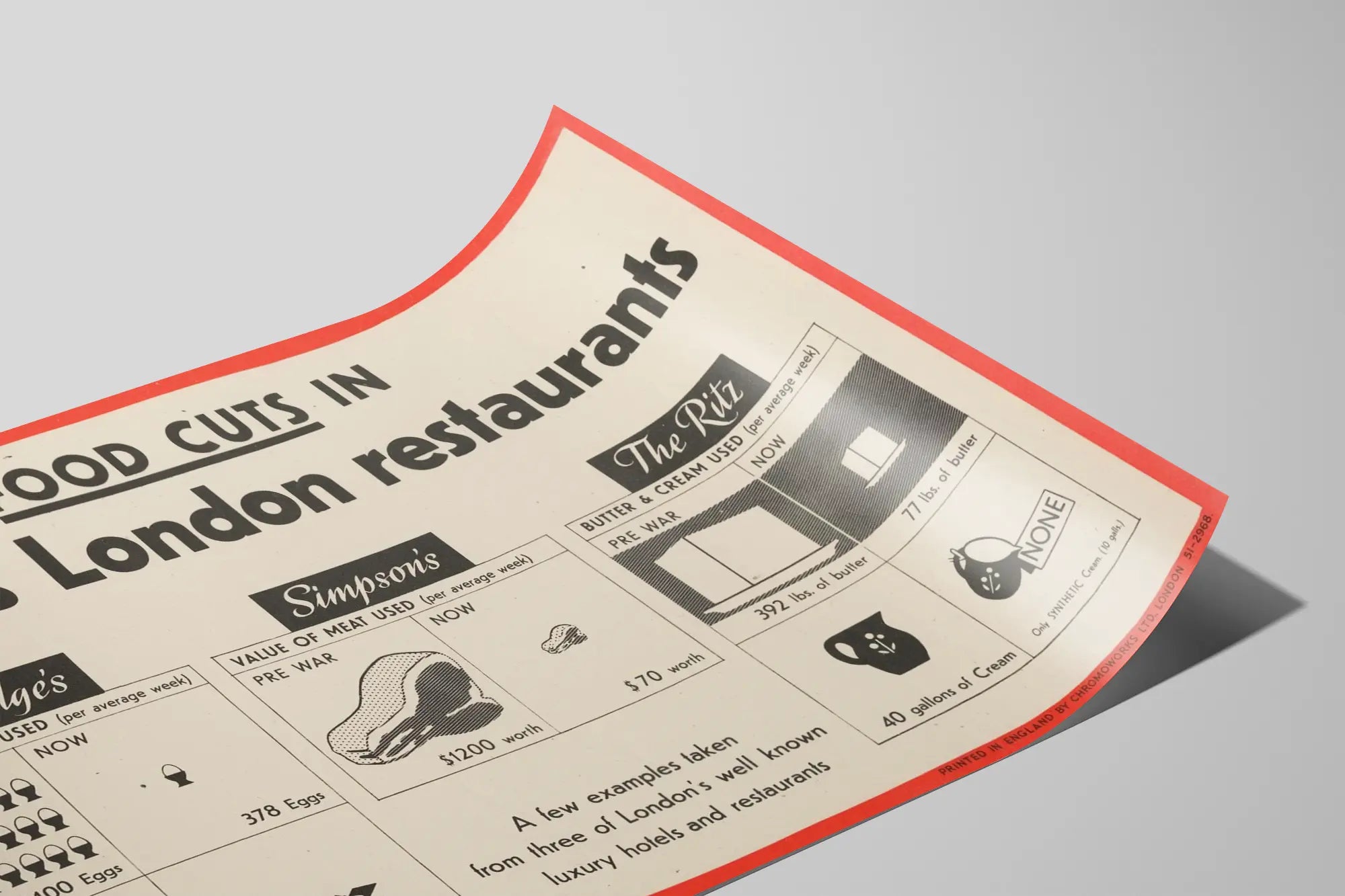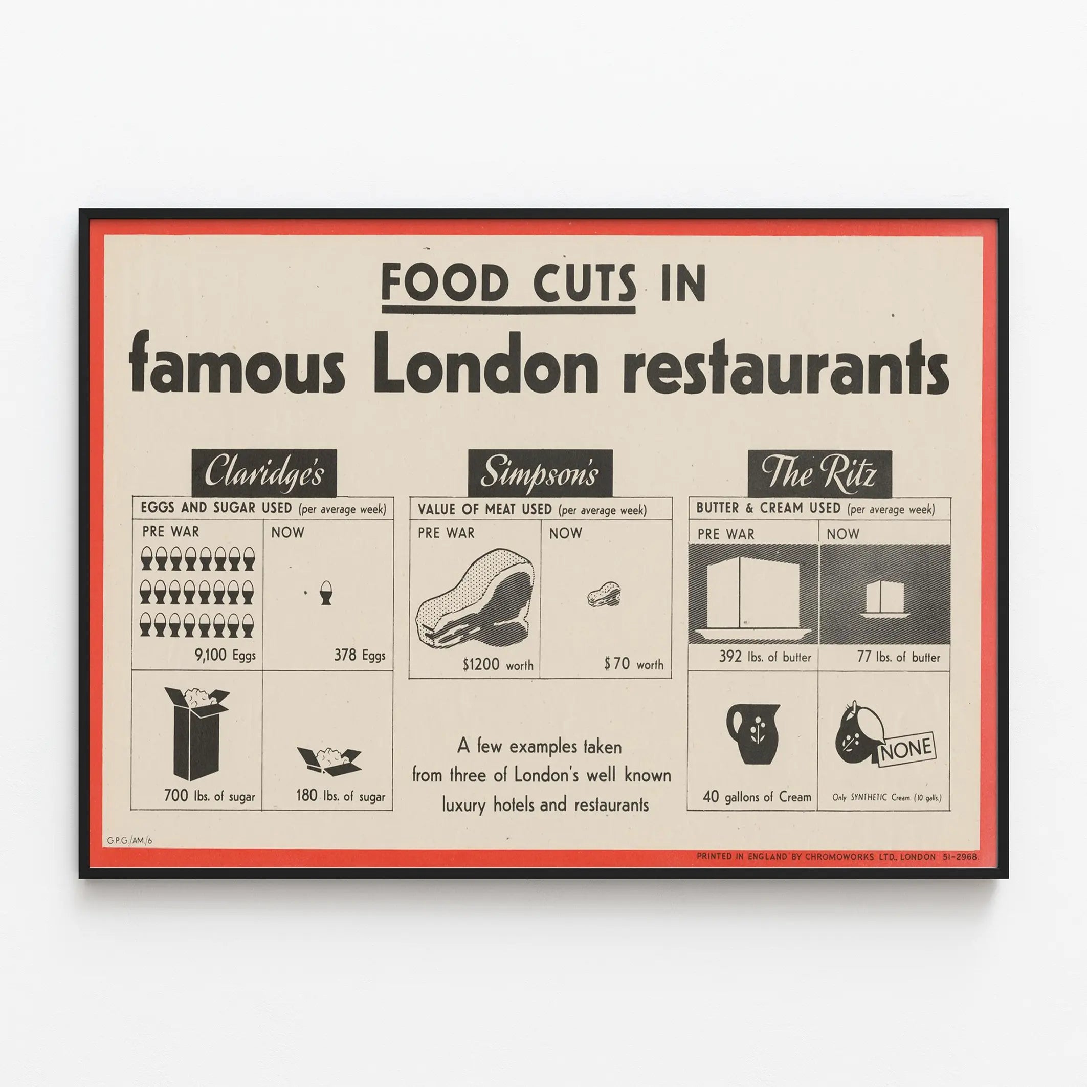 Cette affiche vintage met en avant de manière graphique la réduction des ingrédients utilisés dans trois des restaurants et hôtels de luxe les plus connus de Londres : Claridge's, Simpson's et The Ritz. Présentée comme une décoration murale au style rétro, elle illustre les quantités d'œufs, de sucre, de viande, de beurre et de crème consommées en moyenne chaque semaine avant la guerre et à l'époque actuelle représentée, dévoilant une chute spectaculaire de ces usages. Pour Claridge's, l'affiche montre la consommation hebdomadaire moyenne des œufs et du sucre, avec 9 100 œufs et 700 livres de sucre avant la guerre, contre 378 œufs et 180 livres de sucre aujourd'hui. Simpson's est mis en valeur par la valeur monétaire de la viande utilisée, passant de 1 200 dollars à seulement 70 dollars. Enfin, The Ritz illustre la consommation de beurre et de crème : 392 livres de beurre avant la guerre contre 77 aujourd'hui, tandis que la crème naturelle cède la place à une crème synthétique. Ce poster d'inspiration historique est idéal comme élément de décoration murale, apportant une touche vintage et informative à une cuisine, une salle à manger ou un espace dédié à la gastronomie. Son design graphique épuré et ses contrastes de noir et blanc sur fond clair s’harmonisent avec différents styles d’intérieur. Cette affiche est parfaite pour les amateurs d’histoire culinaire et de décoration authentique, offrant un aperçu visuel des changements alimentaires dans des lieux iconiques. Affiche, poster ou décoration murale, elle valorise les espaces avec élégance et fait un clin d'œil pertinent à l'histoire des restaurants de luxe à Londres.