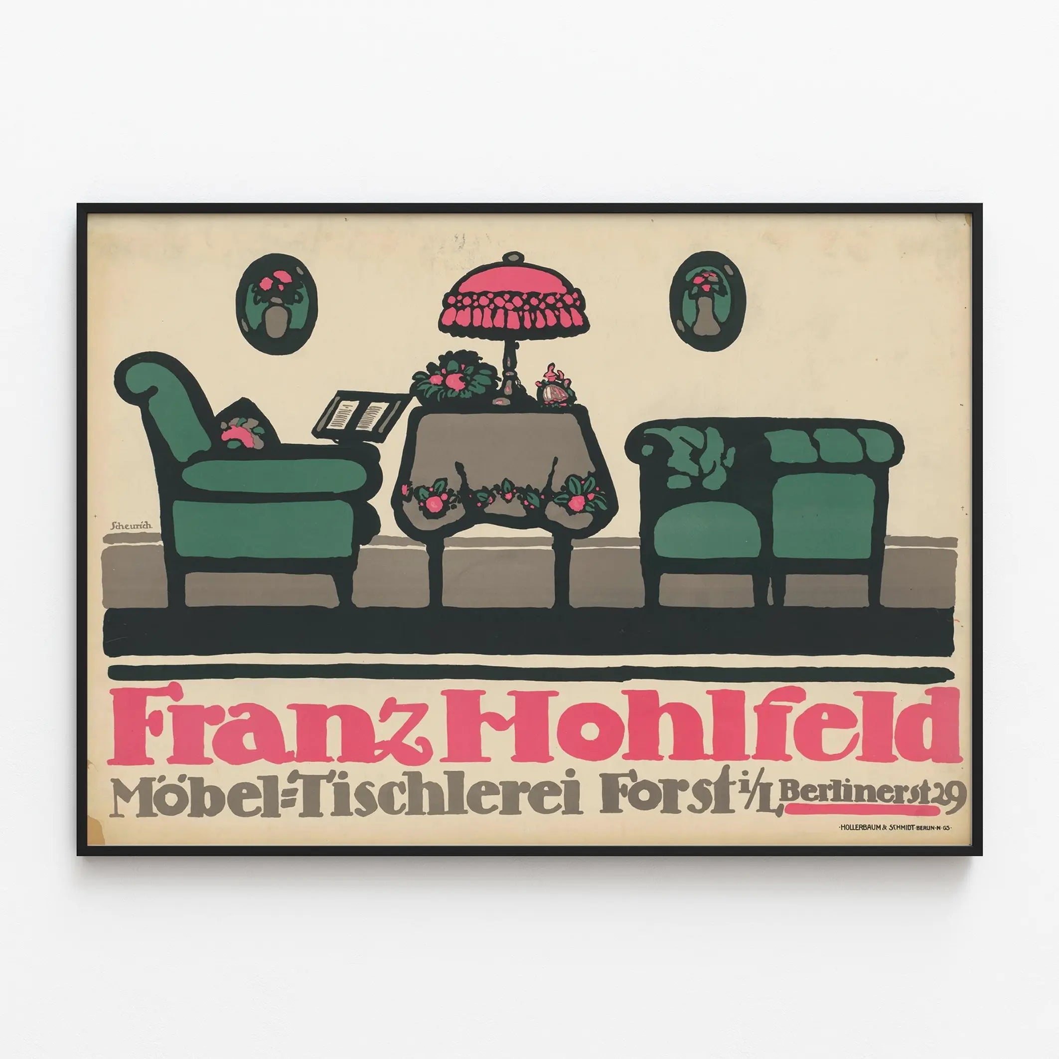 Découvrez cette affiche vintage exceptionnelle mettant en valeur l'art de la fabrication de meubles et l'ébénisterie, signée par le designer Scheurich. Ce poster publicitaire illustre une scène intérieure stylisée, où s'entrelacent harmonieusement meubles et accessoires décoratifs. Au centre, une table recouverte d'une nappe ornée de motifs floraux est surmontée d'une lampe à abat-jour rose vif, habillant l'espace d'une touche rétro élégante. De part et d'autre, deux fauteuils verts contrastent avec le fond beige, apportant confort et sérénité à la scène. Deux tableaux ovales ornés de fleurs rouges complètent la composition en symétrie, renforçant l'effet décoratif de cette illustration graphique. Ce poster est une pièce idéale pour embellir un intérieur avec une décoration murale au style vintage et artisanal. Que ce soit dans un salon, un bureau ou une boutique, ce tableau graphique attire le regard par son esthétique audacieuse et ses couleurs harmonieuses, parfait pour les amateurs de décoration intérieure recherchée et d’art publicitaire historique. Apportez une note de charme et de caractère à vos murs avec cette affiche Franz Hohlfeld, témoignage artistique et promotionnel de l'ébénisterie traditionnelle.