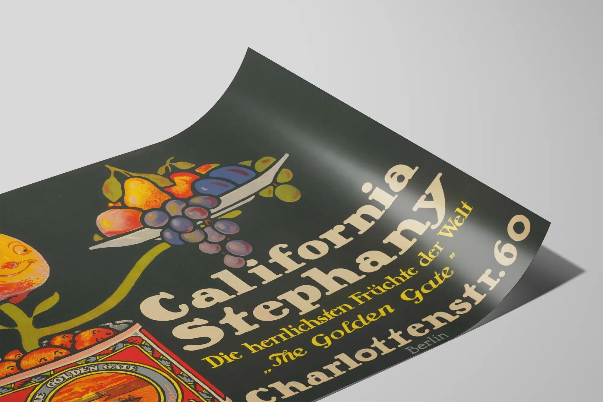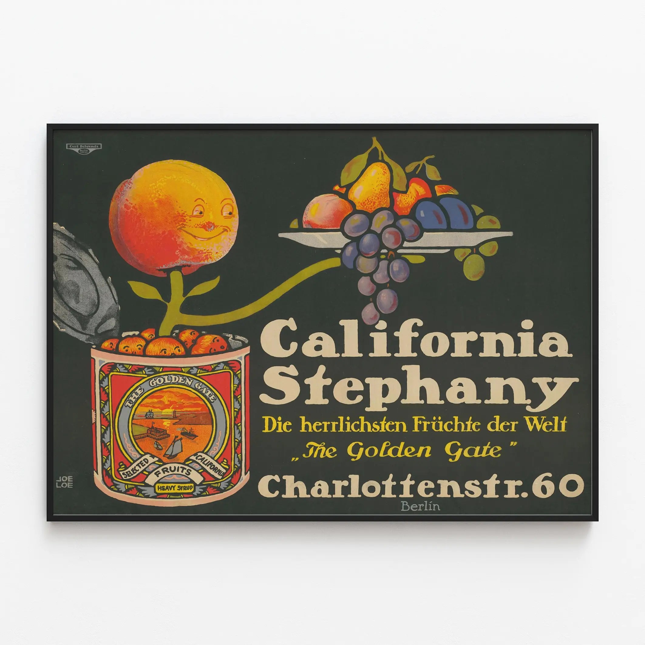 Cette affiche vintage met en scène une illustration colorée et originale représentant un pot de fruits en conserve de la marque "California Stephany". Au centre de l'image, une orange anthropomorphique souriante est posée sur un rameau, tenant une assiette remplie de fruits variés : poires, pêches, raisins et autres fruits colorés. Le pot, décoré d'une étiquette très détaillée aux tonalités chaudes, arbore la mention "The Golden Gate" ainsi que l'inscription "Selected California Fruits". Le fond noir intense permet de faire ressortir les couleurs vives des fruits et le texte en typographie rétro dans différentes teintes de jaune, blanc cassé, et gris. Cette affiche est signée "Joe Loe" en bas à gauche, ajoutant une touche d'authenticité et de style rétro à cette décoration murale. Ce poster au charme d'antan est parfait pour apporter une touche vintage et gourmande à une cuisine, une salle à manger ou un espace dédié à la détente. Il met en avant la richesse et la diversité des fruits de Californie avec une approche artistique pleine de fantaisie et d'humour. Que ce soit pour les amateurs de décoration murale vintage, les passionnés d'illustrations alimentaires ou simplement pour égayer votre intérieur, cette affiche est un excellent choix. Son style graphique rappelle les affiches publicitaires des années passées, idéal pour un intérieur qui cherche à associer nostalgie et esthétisme original. Une décoration murale qui invite à la gourmandise tout en apportant une ambiance chaleureuse et colorée.