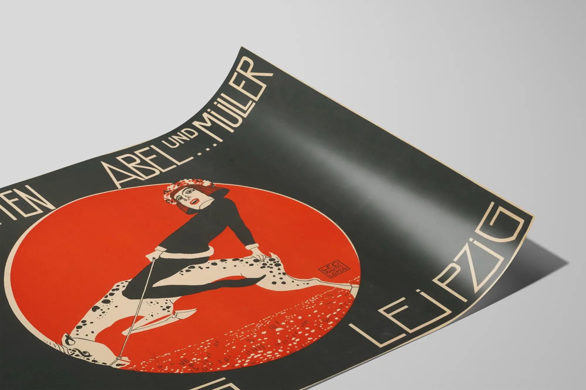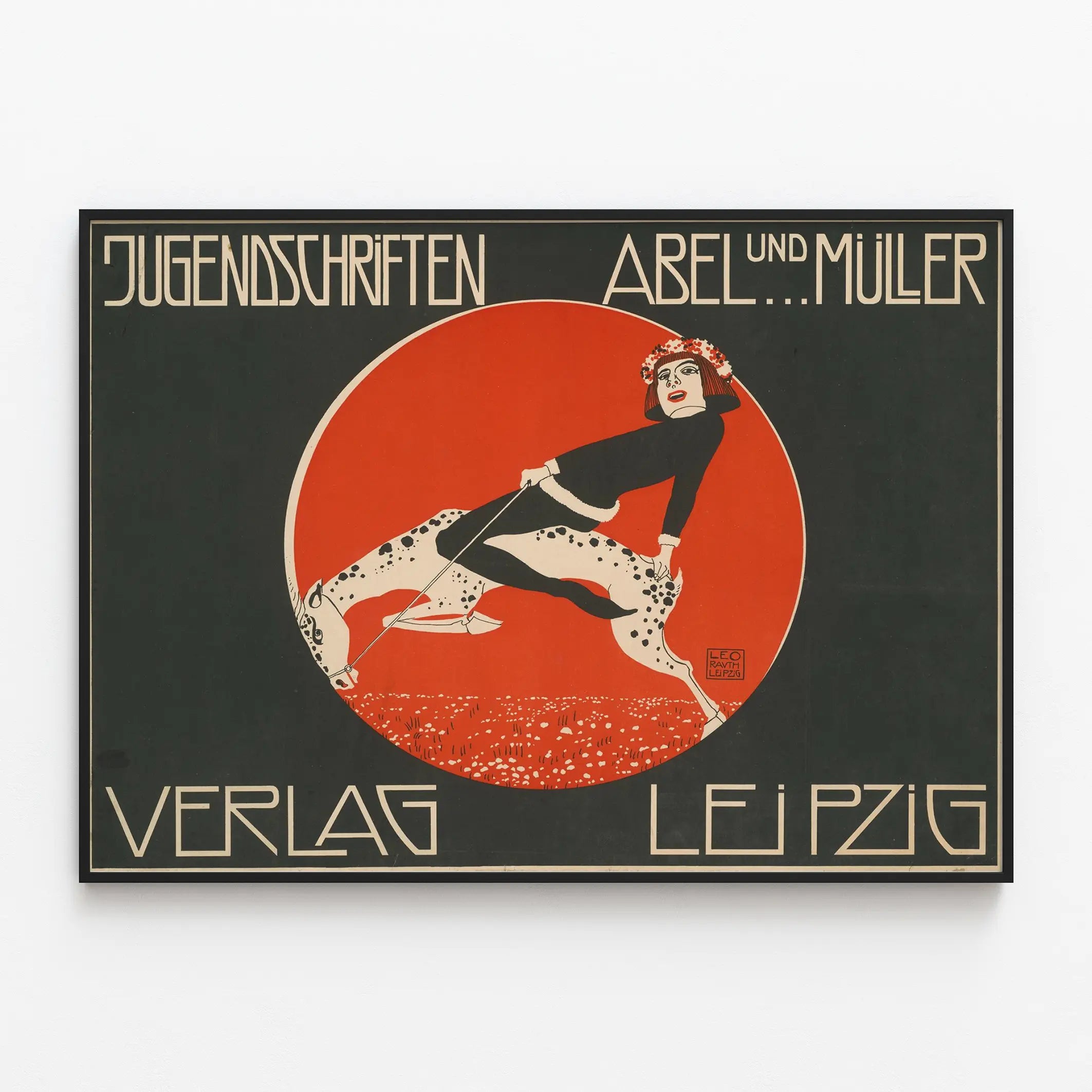 Découvrez cette affiche vintage au style graphique marqué, idéale pour une décoration murale originale et pleine de caractère. Ce poster représente une jeune femme vêtue de noir, coiffée d'une couronne de fleurs rouges, chevauchant un cheval blanc tacheté. Le tout est encadré par un fond rouge vif circulaire qui contraste magnifiquement avec le noir dominant du reste de la composition. Cette affiche publicitaire annonce les "Jugendschriften" du Verlag Abel et Müller à Leipzig, mettant en avant un design typographique et illustration typique du début du 20e siècle. Parfait pour une décoration murale dans un intérieur au style rétro ou artistique, ce tableau en format poster apporte une dynamique visuelle forte à tout espace. Les couleurs simples mais efficaces (rouge, noir, blanc) et le dessin stylisé font de cette affiche un élément déco unique, à la fois vintage et moderne. Pour les amateurs d’affiches anciennes ou pour ceux qui recherchent une décoration murale originale, ce poster est une pièce qui capte immédiatement l’attention grâce à son graphisme distinctif et sa composition harmonieuse. Facile à accrocher, cette affiche propose une alternative artistique pour décorer un salon, un bureau ou une boutique avec une touche d'histoire imprimée.