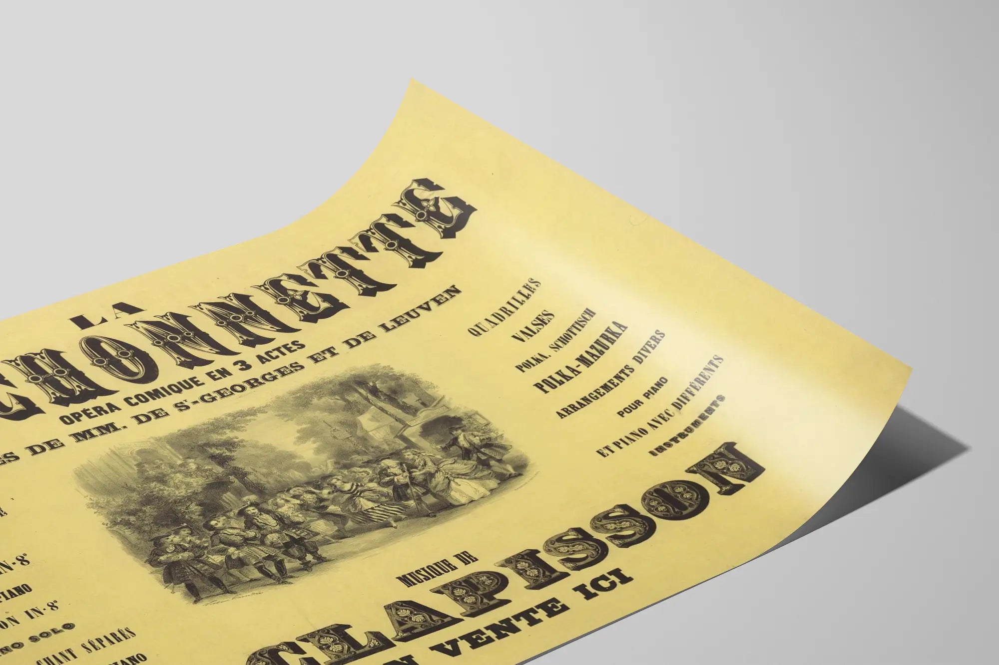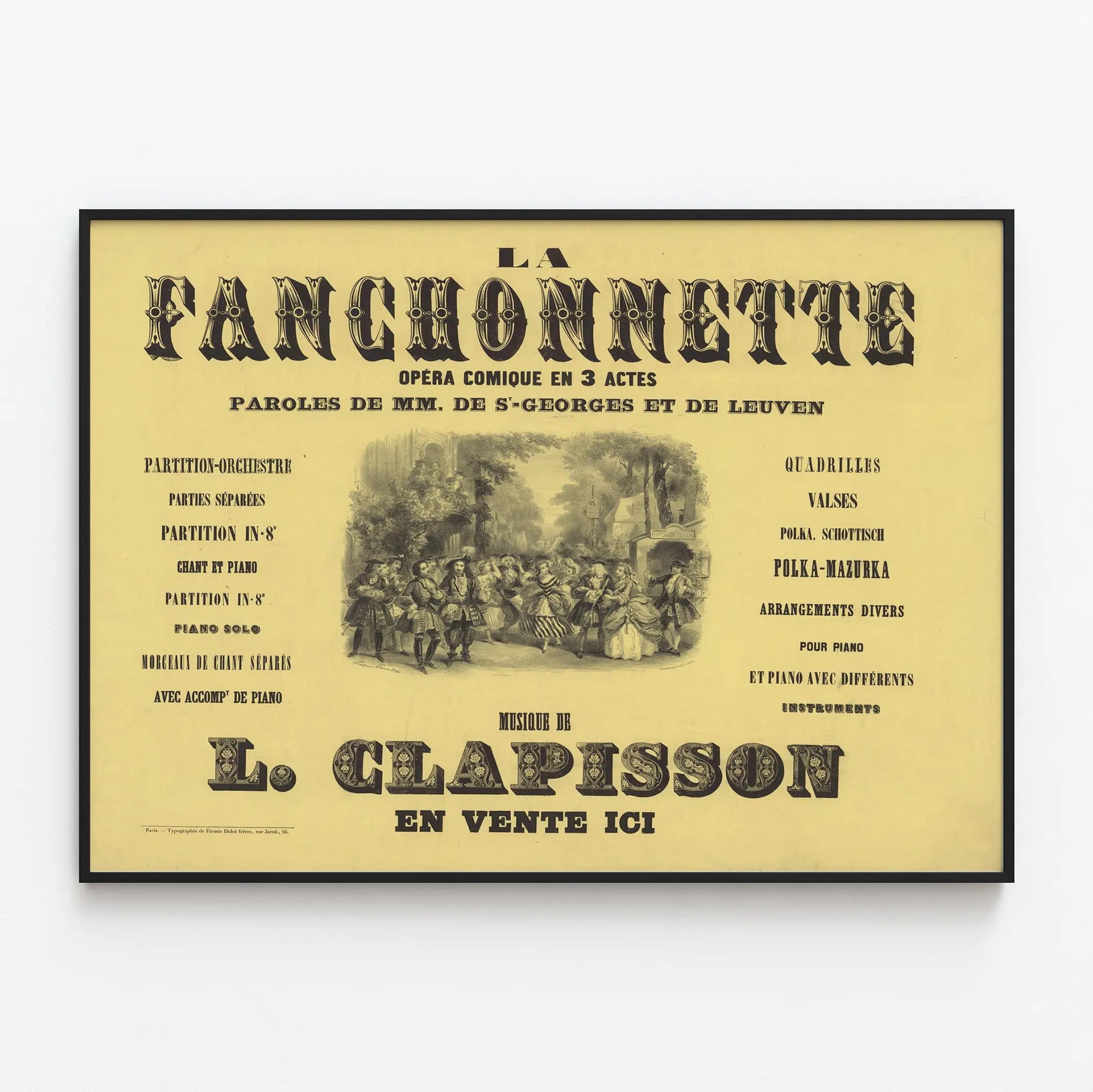 Découvrez cette affiche vintage intitulée "La Fanchonnette", une pièce de collection qui apporte une touche artistique et historique à votre décoration murale. Ce poster illustre une annonce de l'opéra comique en 3 actes avec paroles de MM. de Saint-Georges et de Leuven, accompagné de la musique de L. Clapisson. Un choix parfait pour les amateurs de musique classique et d'art typographique, cette affiche ancienne affiche un style typique de la période avec une composition équilibrée entre texte et illustration. Ce visuel présente un dessin central montrant des personnages en habits d'époque dans une scène de rue animée, entourés de diverses informations textuelles sur la partition-orchestre, les parties séparées, les partitions pour chant et piano, ainsi que différentes danses comme les valses, polka, schottisch, et polka-mazurka. Le rendu en noir sur fond jaune pâle met en valeur le charme rétro du document. Accrochez ce poster mural dans un salon, un bureau ou une salle de musique pour une ambiance culturelle et raffinée. Cette œuvre murale est idéale pour enrichir un intérieur aux influences classiques ou pour un décor thématique sur l’univers de l’opéra et de la musique du XIXe siècle. Offrez une décoration murale qui raconte une histoire grâce à cette affiche ancienne La Fanchonnette, parfaite pour collectionneurs ou passionnés de typographie et de patrimoine musical. Retrouvez un équilibre entre texte et image, typique des affiches du temps, qui attire l'œil et invite à la découverte. Une option élégante et originale pour sublimer vos murs avec une œuvre d'impression classique et artistique.