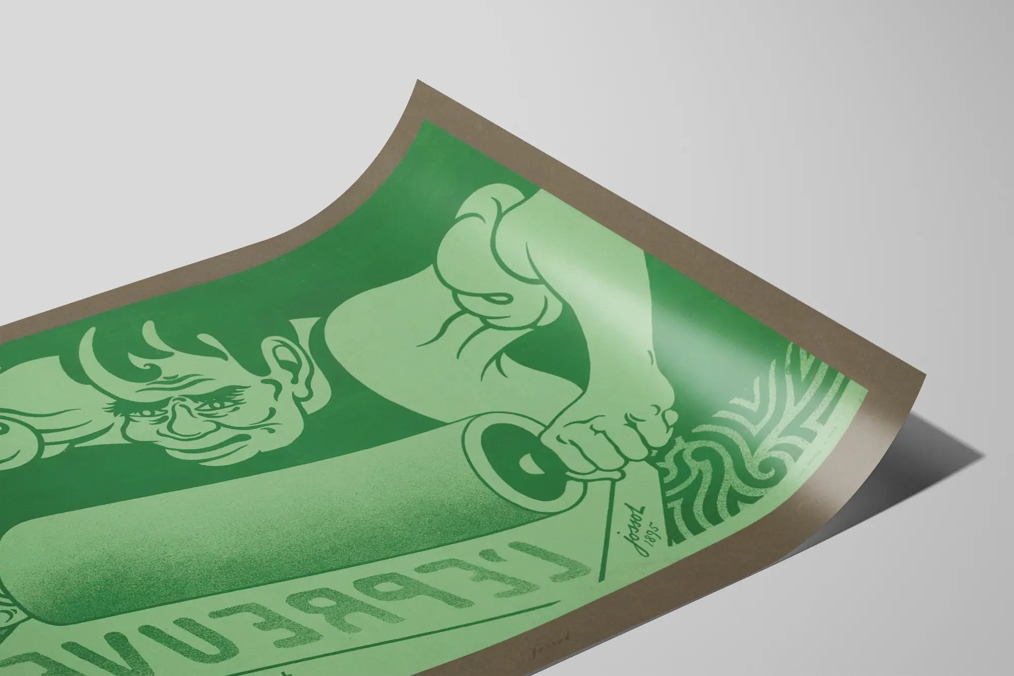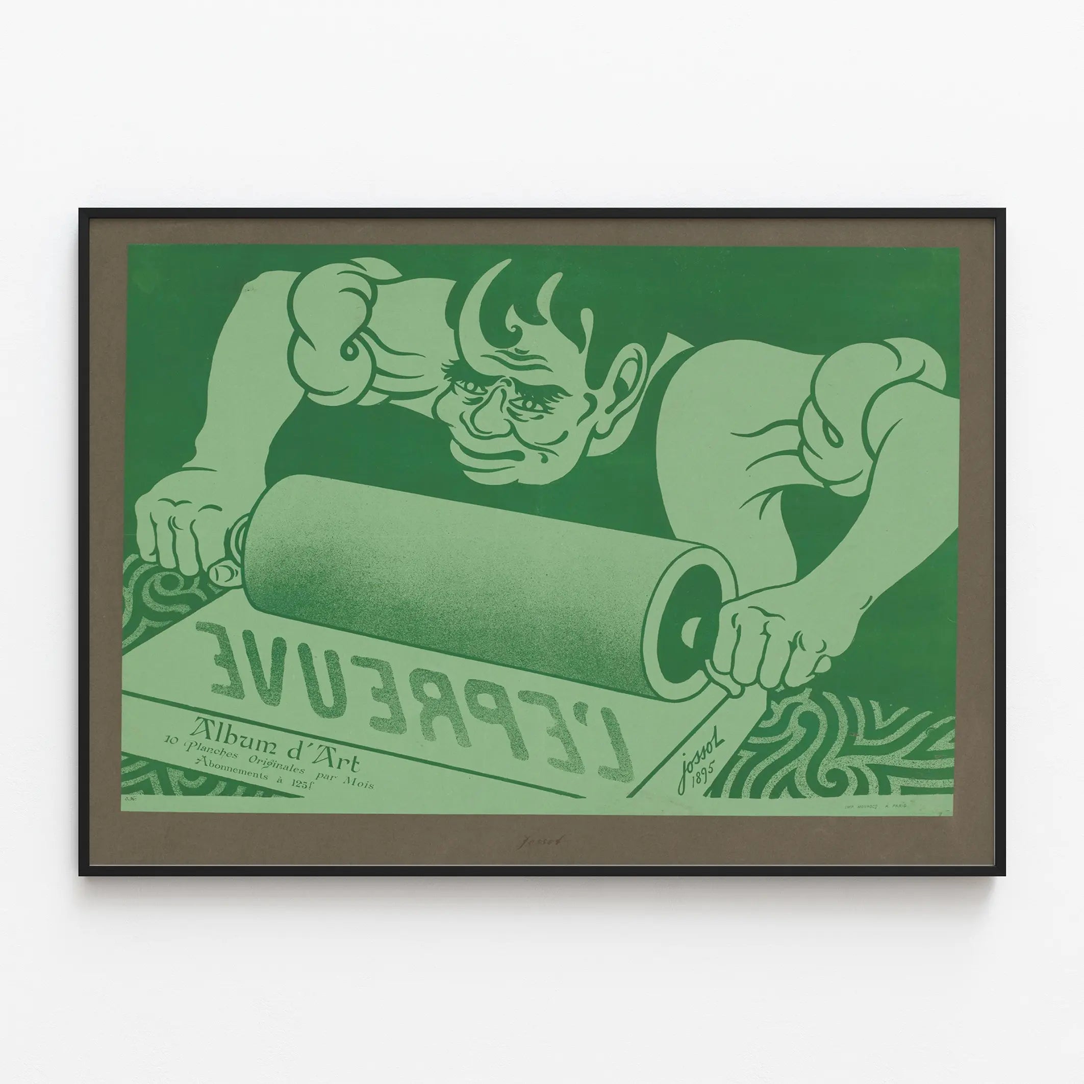Cette affiche vintage représente une scène illustrée avec un style graphique prononcé, évoquant l'univers de la gravure ou de l'impression artisanale. On y voit un personnage concentré, un homme musclé aux traits expressifs, en train d'utiliser un rouleau pour imprimer le mot "L'ÉPREUVE" à l’envers sur une feuille. Le fond est dominé par une teinte verte avec quelques nuances permettant de créer du volume et du relief, tandis que le cadre extérieur est d’une couleur marron neutre, ce qui met en valeur la scène centrale. La composition joue habilement sur la simplicité des couleurs et des formes, accentuant la force visuelle du message lié à la gravure ou à l'impression d'art. Cette affiche originale met en avant le thème de la technique d'impression traditionnelle, soulignant la mécanique et la minutie nécessaires pour créer des œuvres d'art imprimées. Il s'agit clairement d'une pièce de décoration murale qui trouvera sa place dans un intérieur au style vintage, artistique, ou dans un espace dédié à la créativité, au design graphique ou à l'artisanat. Ce poster est idéal pour ceux qui apprécient l'alliance entre l'art traditionnel et la communication visuelle claire. Avec ses dimensions généreuses et son graphisme fort, cette affiche se pose comme un élément clé pour sublimer un mur, apportant une touche rétro et authentique. Elle peut être encadrée pour une présentation élégante ou accrochée telle quelle pour un effet plus brut et industriel. En décoration murale, ce poster invite à la réflexion sur les procédés d’impression tout en offrant une esthétique soignée, relevant du domaine de l'affiche publicitaire d’époque. Cette création originale est également idéale pour les amateurs de lithographie ou d’albums d’art, soulignant un savoir-faire artistique propre à la fin du XIXe siècle tout en s’intégrant parfaitement dans une décoration contemporaine ou éclectique. Ce tableau mural capte l’attention par son expression sincère et sa représentation dynamique d’un artisan au travail, offrant un rendu visuel captivant et évocateur.