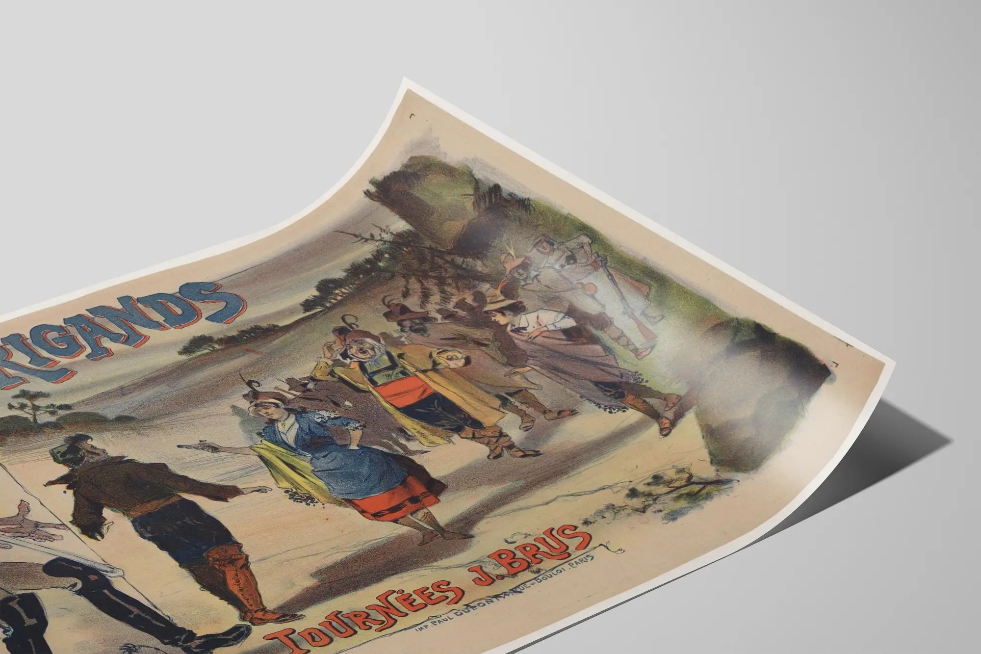 Cette affiche vintage représente une scène théâtrale intitulée « Les Brigands », mise en avant pour les tournées J. Brus. L'image est riche en détails et illustre un groupe de personnages costumés dans un décor champêtre, donnant une ambiance dramatique et pittoresque à cette décoration murale. Au premier plan, une femme en tenue traditionnelle tient une arme pointée vers un homme, tandis qu'un groupe de personnages, certains armés, l'accompagne en arrière-plan. Le style graphique évoque les affiches publicitaires du XIXe siècle, utilisant des couleurs douces et des contours expressifs, typiques des affiches anciennes. Ce poster est idéal pour les amateurs de décoration murale originale et d’art graphique rétro, apportant un caractère historique et théâtral à tout intérieur. Parfait pour décorer un salon, un bureau ou une salle de spectacle, ce tableau offre une touche d'authenticité et de mystère, transportant le spectateur dans l'univers des drames historiques et populaires. L'impression typographique située en bas confirme l'authenticité et l'origine parisienne de cette affiche, imprimée par Paul Dupont. En ajoutant cette pièce unique à votre collection d'affiches, vous optez pour une décoration murale qui allie charme d'antan et esthétisme graphique, parfaite pour les passionnés de théâtre et d'histoire visuelle.