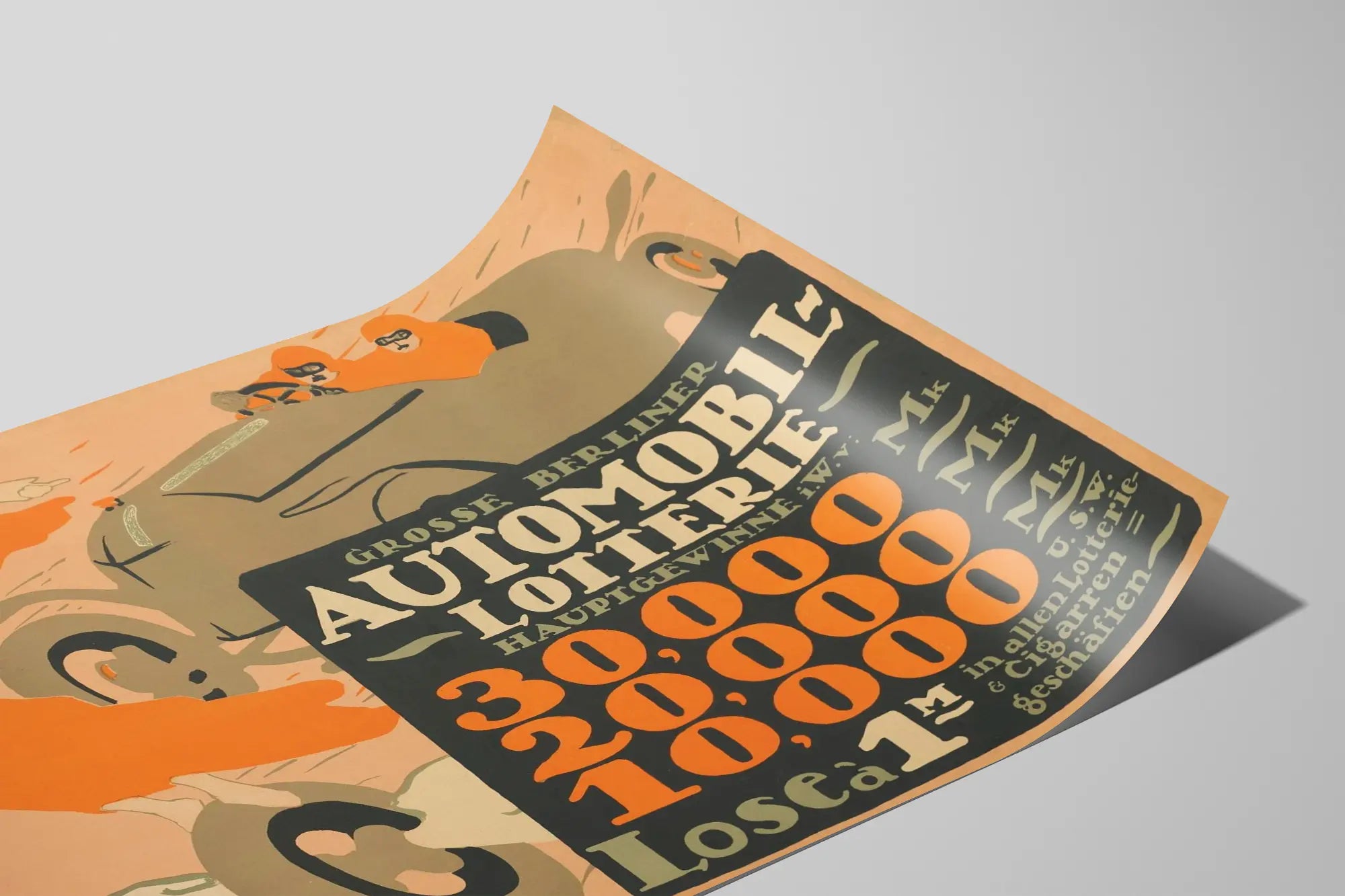 Cette affiche vintage représente une publicité pour une loterie automobile berlinoise, caractérisée par un style graphique épuré et des couleurs dominantes orange et gris clair. L'illustration met en scène une voiture de course stylisée, accompagnée de deux pilotes en tenue orange et lunettes noires, accentuant l'aspect dynamique et sportif. Sur la droite, un panneau noir présente les informations clés de la loterie en lettres blanches, avec des chiffres orange marquants les montants des prix importants : 30 000, 20 000 et 10 000 marks. Le texte, en allemand, indique également que les tickets sont vendus à 1 mark dans divers commerces de loterie et de cigares. Cette affiche est une excellente pièce de décoration murale pour les amateurs de vintage, d'histoire automobile et de graphisme rétro. Elle peut être utilisée comme poster ou tableau décoratif, apportant une touche originale et nostalgique à tout intérieur, qu'il s'agisse d'un salon, d'un bureau ou d'une salle de loisirs. L'affiche se distingue par son équilibre entre illustration et typographie, hommage aux affiches publicitaires du début du XXe siècle. Son graphisme simple mais impactant valorise à la fois le produit proposé – la loterie automobile – et l'univers des courses de voitures anciennes. Elle s'adapte parfaitement aux styles de décoration murale qui mêlent charme rétro et éléments intemporels. Ce poster vintage devient ainsi un élément clé pour créer une ambiance unique et pleine de caractère autour d'un thème automobile ou collectionneur. Que ce soit pour enrichir une collection d'art graphique ou pour décorer un espace de vie, cette affiche confère à la décoration murale une valeur esthétique et historique, digne des anciennes campagnes publicitaires berlinoises.
