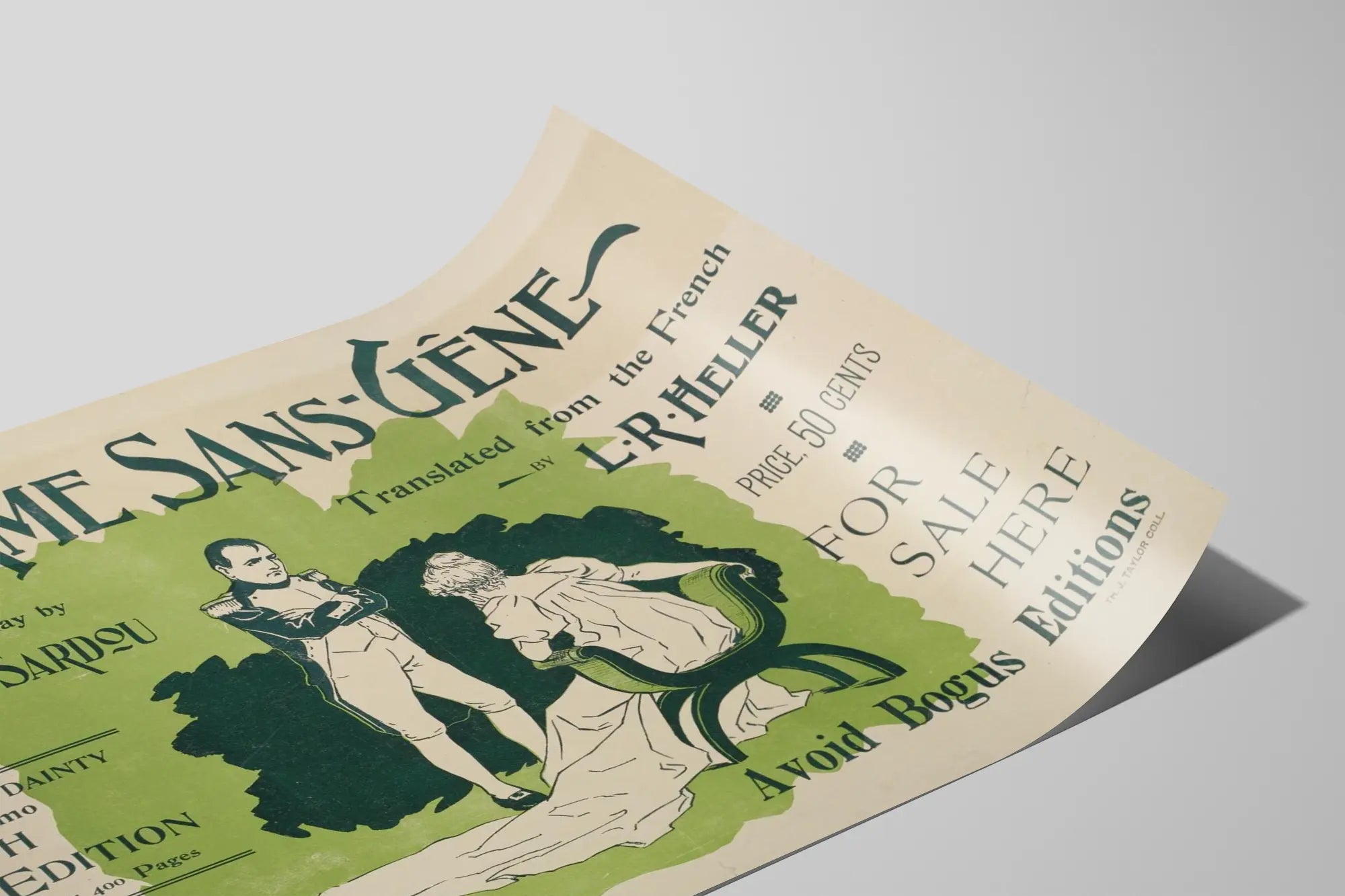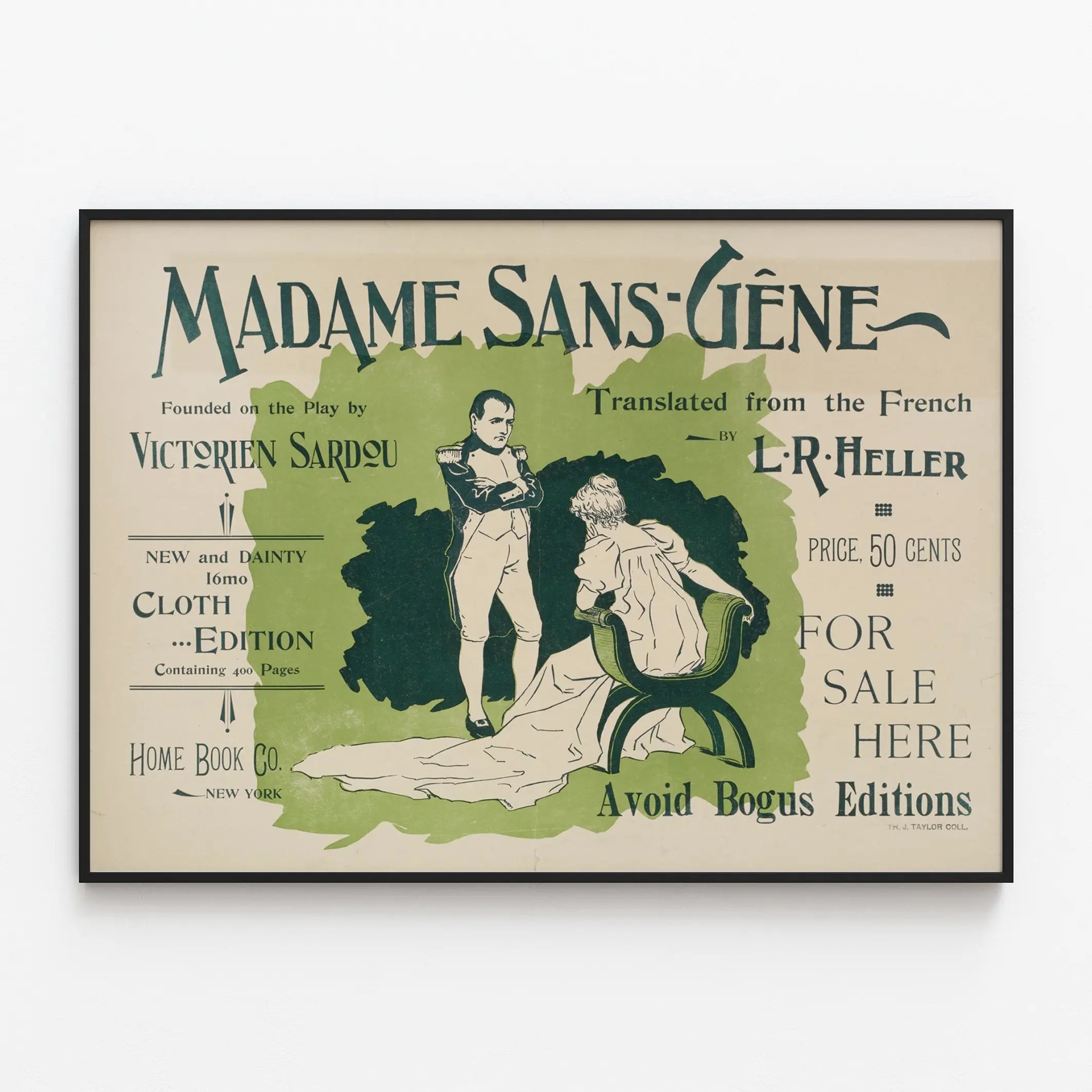 Cette affiche est une excellente idée de décoration murale pour ceux qui souhaitent apporter une touche d’histoire et de culture française à leur intérieur. Qu’elle soit accrochée dans un salon, un bureau, ou un espace artistique, elle offre un impact visuel fort grâce à ses contrastes et son style typographique d’époque. Le nom « Madame Sans-Gêne » inscrit en grand au sommet attire immédiatement l’attention, tandis que les inscriptions secondaires détaillent la provenance théâtrale et la traduction anglaise réalisée par L. R. Heller.