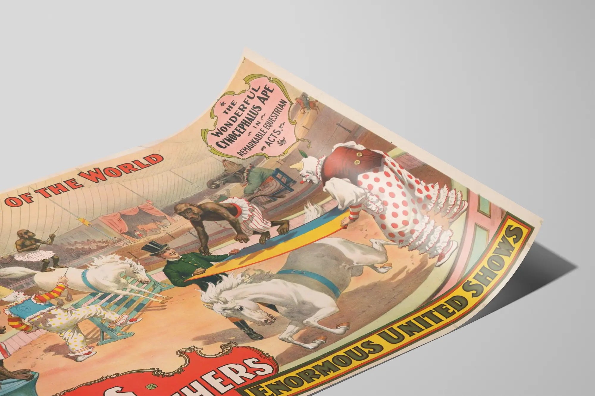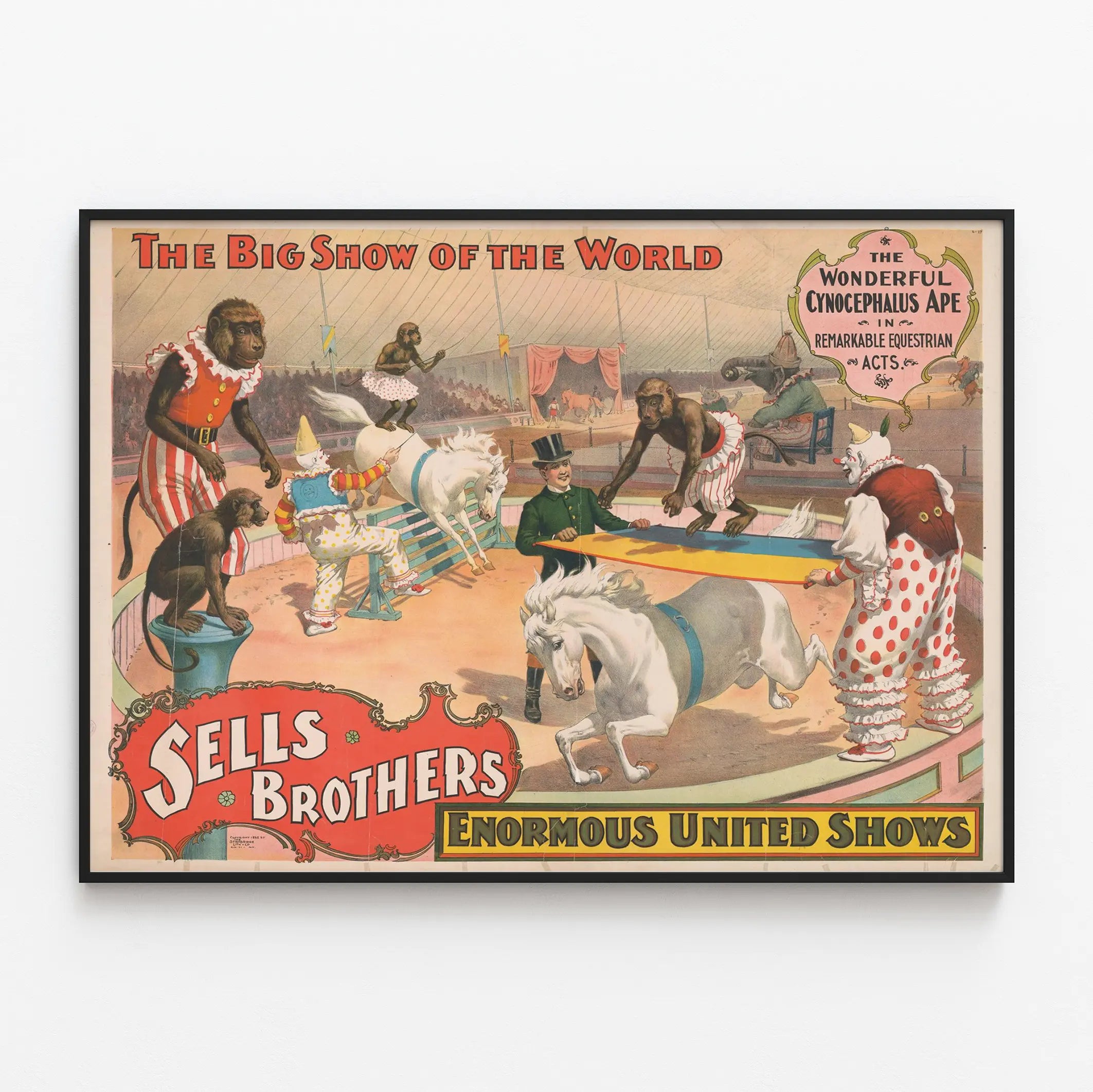 Dieses originale Vintage-Poster zeigt die Reitshow der Sells Brothers mit dem Titel „Die große Show der Welt“. Im Mittelpunkt stehen Affen mit Cynocephalen in bunten Kostümen, die beeindruckende Akrobatik mit weißen Pferden in einem lebhaften Zirkus vorführen. Das Bild illustriert eine erstaunliche Nummer, bei der die Affen über Hindernisse klettern und springen, begleitet von verkleideten Clowns, die der Darbietung eine humorvolle und fantasievolle Note verleihen. Dieses Wandposter besticht durch seine leuchtenden Farben und seinen typischen Retro-Stil, der an die Showposter des frühen 20. Jahrhunderts erinnert. Perfekt, um eine vintage und originelle Atmosphäre in einem Raum zu schaffen, ist dieses Wandbild eine ideale Wahl für Liebhaber von Zirkus- oder Tiermotiven. Die dynamische Komposition und die sorgfältigen Details bieten einen einzigartigen visuellen Reiz und machen dieses Poster zu einem faszinierenden Dekorationselement. Ob für eine Sammlung alter Poster oder zur Verschönerung eines Wohnzimmers, Büros oder Freizeitraums – dieses gedruckte Kunstwerk fängt die Essenz traditioneller Reitshows und die malerische Welt vergangener Zirkusse ein. Sein Stil ruft Nostalgie hervor und erinnert an die kulturelle Bedeutung der fahrenden Shows in der Geschichte der Unterhaltung. Dieses Poster ist ein hervorragendes Beispiel für ein künstlerisches Dekorationsplakat, das das Thema Zirkus und dressierte Tiere hervorhebt, ideal, um eine Wand mit einem Hauch von Originalität und Geschichte zu bereichern.