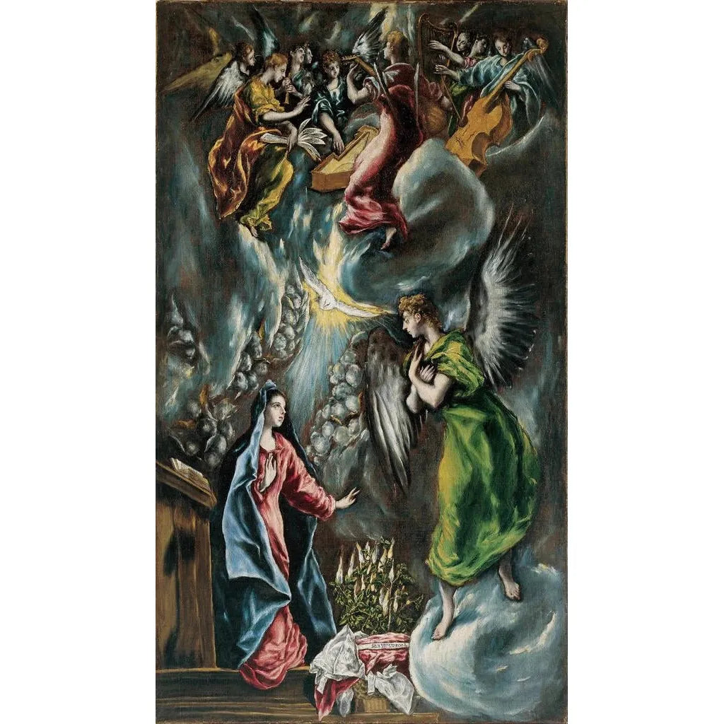 L'Annonciation di El Greco è un'opera che trascende il tempo e lo spazio, catturando un momento di rivelazione divina. La composizione dinamica, con la Vergine Maria al centro, è circondata da angeli e simboli sacri, creando una scena allo stesso tempo drammatica e serena. I colori vivaci e i contrasti marcati accentuano l'intensità dell'istante, mentre le figure allungate e i drappeggi fluidi testimoniano lo stile unico dell'artista. Questa tela invita alla meditazione, evocando l'incontro tra il divino e l'umano.