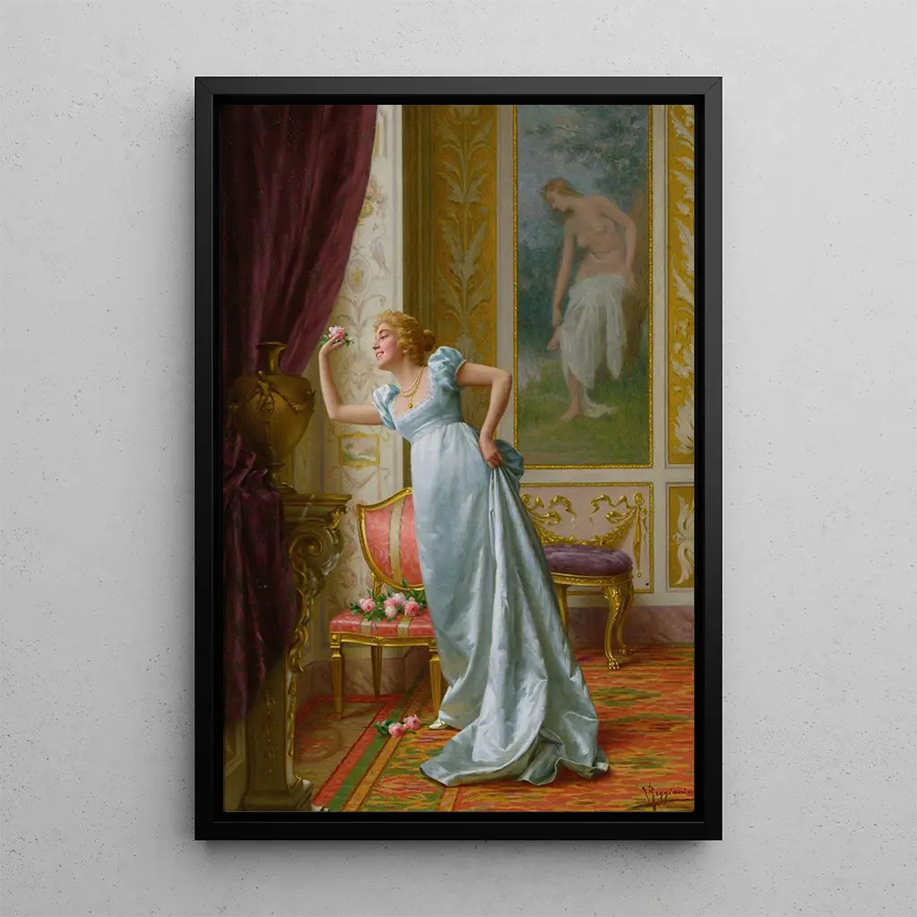La stampa d'arte "L'attrazione" di Vittorio Reggianini ci immerge in un universo raffinato, dove la bellezza e la grazia si intrecciano. Questo quadro, ricco di dettagli, rappresenta una scena intima in cui una donna, vestita con un abito sontuoso, cattura lo sguardo con il suo fascino irresistibile. I colori caldi e le sfumature delicate creano un'atmosfera al tempo stesso romantica e nostalgica. Reggianini utilizza una tecnica di pittura ad olio che valorizza le texture dei tessuti e la luminosità dei volti, rendendo ogni elemento vivo. Questo quadro è un vero invito alla contemplazione, dove ogni sguardo rivela una nuova sfaccettatura dell'eleganza.