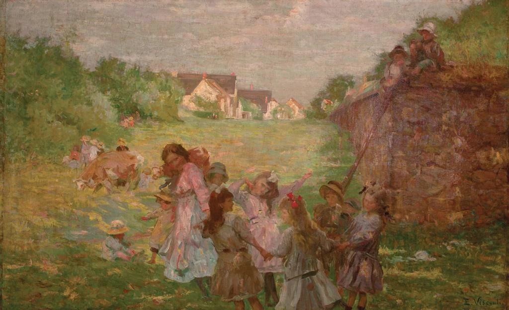 La tela "Ronde d'enfants" di Eliseu Visconti evoca un'atmosfera gioiosa e ludica. I bambini, catturati in un momento di gioco, sono circondati da colori vivaci e forme morbide che trasmettono una sensazione di felicità e leggerezza. La tecnica dell'artista, mescolando impressionismo e realismo, permette di creare una scena vivace in cui ogni bambino sembra animato da una personalità propria. Le sfumature di blu e verde, associate a tocchi di giallo, rafforzano la freschezza di questa composizione, invitando lo spettatore a immergersi in un universo di innocenza e gioia infantile.