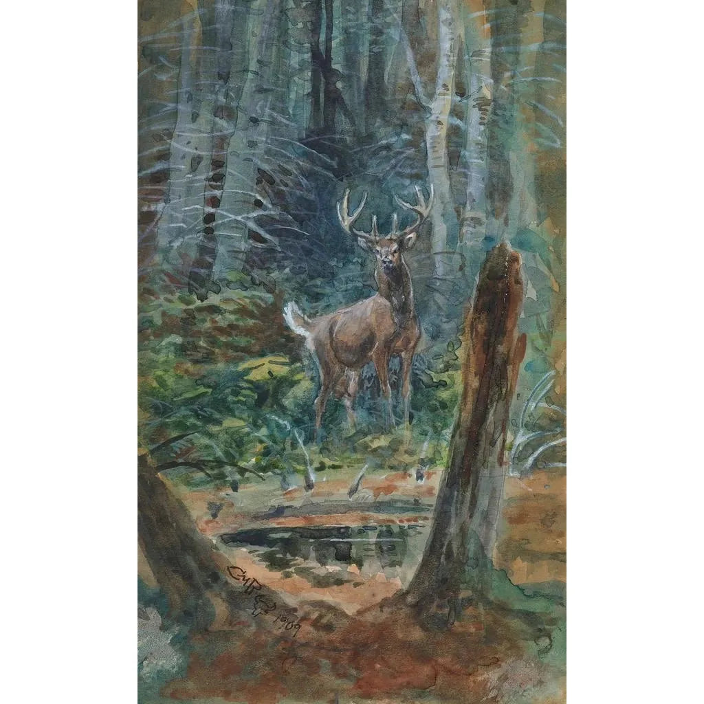 Dans cette œuvre captivante, "Cerfs dans le vallon", Charles Marion Russell nous plonge au cœur d'un paysage naturel où la faune s'épanouit. Les cerfs, majestueux et gracieux, se déplacent avec élégance dans un vallon verdoyant, baigné par une lumière douce et dorée. Les couleurs terreuses et les nuances de vert évoquent une atmosphère paisible, tandis que les détails minutieux de la fourrure des animaux et des feuillages créent une sensation de réalisme saisissante. L'artiste parvient à capturer non seulement la beauté des cerfs, mais aussi l'harmonie de leur environnement, invitant le spectateur à une contemplation sereine de la nature.