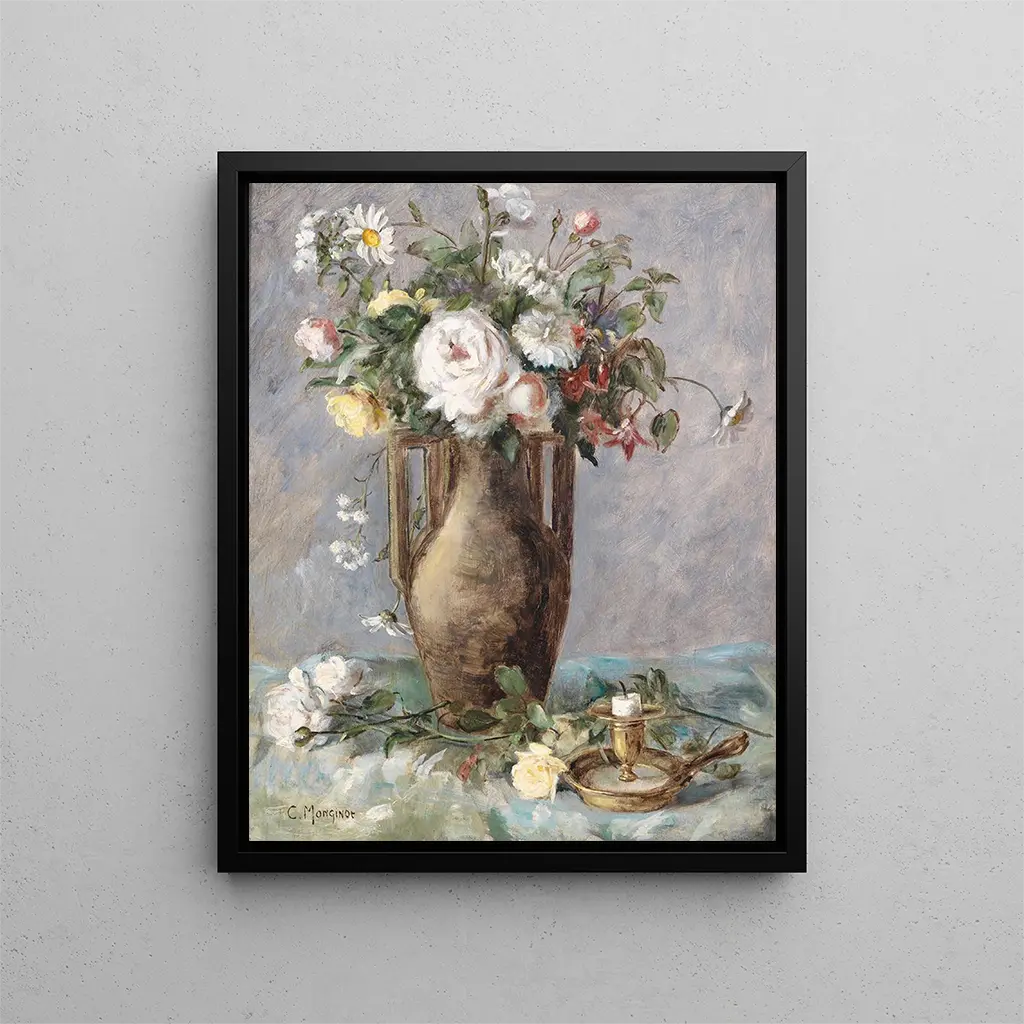 L'unicità di "Composition florale con candelabro" risiede nel modo in cui Charles Monginot riesce a unire la precisione del disegno alla fluidità delle forme organiche. I fiori, sebbene rappresentati con una precisione meticolosa, sembrano vibranti di vita, come se fossero pronti a sbocciare oltre la tela. Il candelabro, elemento centrale della composizione, aggiunge una dimensione di calore e intimità, evocando momenti di convivialità e raccoglimento. La palette di colori scelta dall'artista, oscillando tra tonalità morbide e tocchi più vivaci, crea un equilibrio armonioso che cattura lo sguardo e affascina la mente. Ogni dettaglio, dalla scelta dei fiori alla disposizione degli elementi, testimonia una padronanza tecnica e una sensibilità artistica rara, rendendo questa opera un pezzo imprescindibile per gli appassionati di arte floreale.