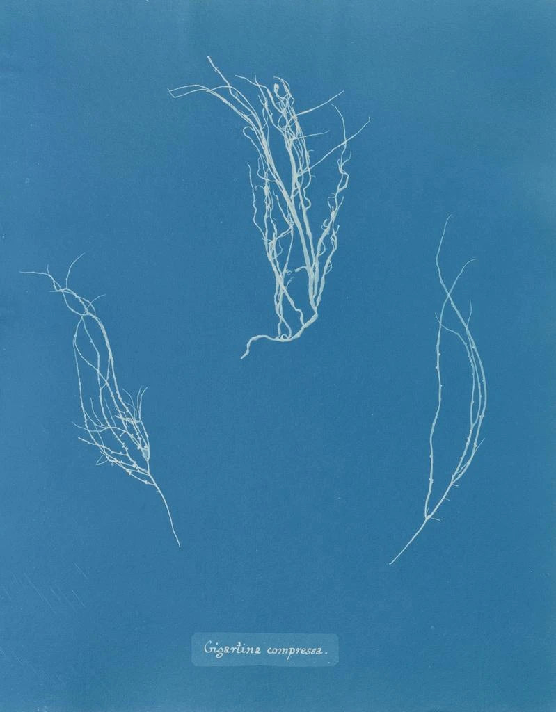 Lo stile di Comprimé Gigartina si distingue per il suo approccio unico alla fotografia. Utilizzando la tecnica del cyanotype, Atkins ha creato impressioni di una profondità e di una chiarezza notevoli, dove le sfumature di blu si mescolano armoniosamente alle silhouette delicate delle alghe. Ogni dettaglio è accuratamente reso, rivelando le venature e i contorni delle piante marine con una fedeltà impressionante. Questa scelta di tecnica, allo stesso tempo innovativa ed estetica, conferisce all’opera un’atmosfera quasi onirica, mescolando scienza e arte in una danza sottile. La composizione, sia semplice che sofisticata, permette all’occhio di soffermarsi sulle forme, creando così una connessione intima tra l’osservatore e la natura. In questo modo, Comprimé Gigartina è più di una semplice rappresentazione; è un invito a esplorare i misteri della vita marina.