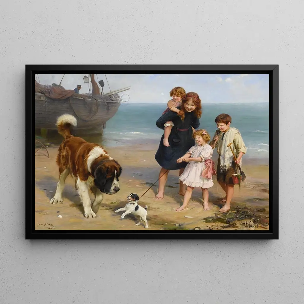 In questa affascinante opera, Arthur John Elsley ci immerge in un universo dove tenerezza e gioia di vivere si incontrano. La tela, ricca di colori delicati e dettagli minuziosi, rappresenta una scena incantevole di due cani che riposano pacificamente in un ambiente bucolico. Le sfumature di verde e marrone richiamano la natura circostante, mentre la luce gioca sul pelo degli animali, creando un'atmosfera calda e accogliente. Ogni colpo di pennello sembra raccontare una storia, quella di un'amicizia sincera e di un momento di serenità condiviso.