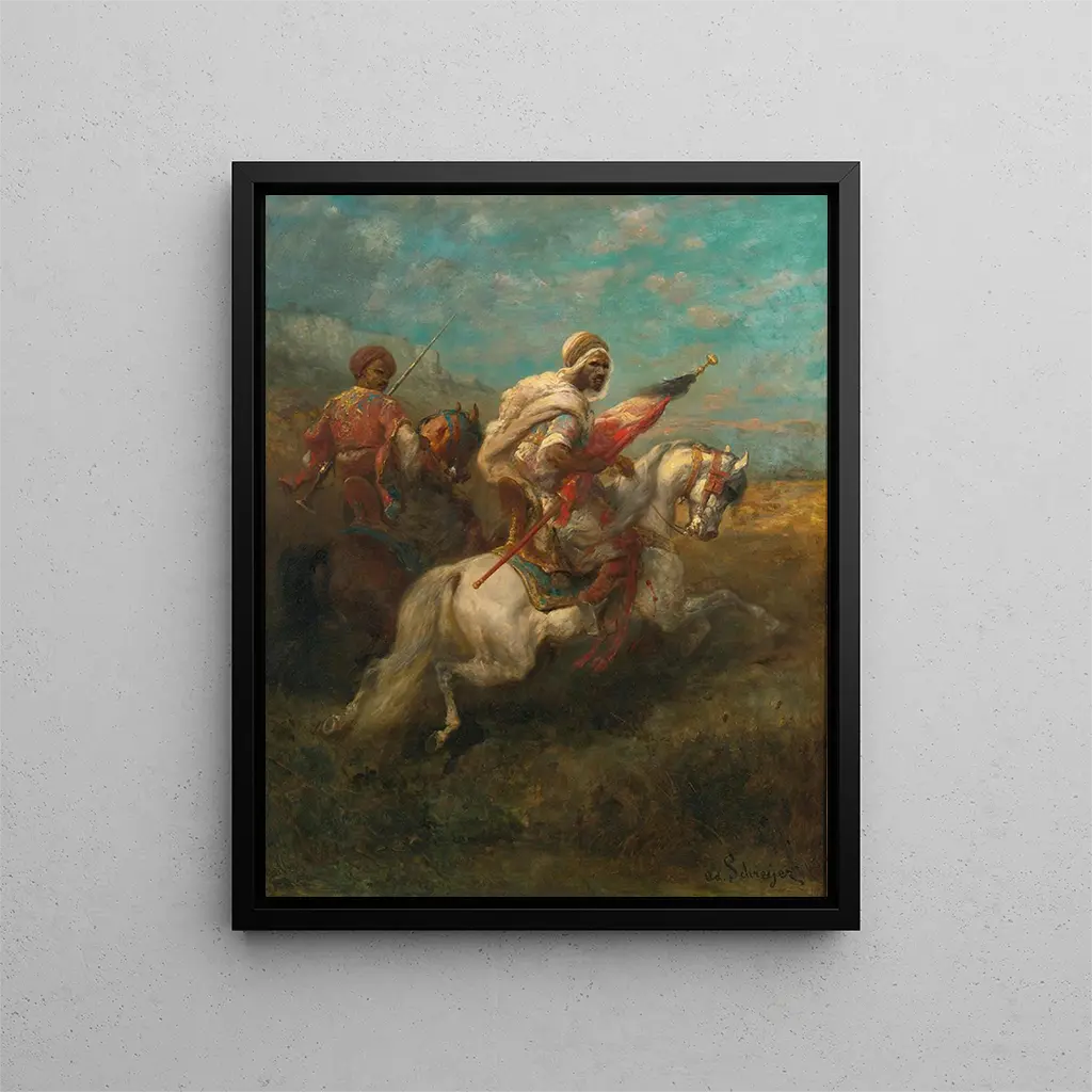 Adolf Schreyer, nato nel 1828, è riconosciuto come uno dei maestri della pittura di paesaggi e scene equestre del XIX secolo. Influenzato dal movimento romantico, ha saputo unire il suo interesse per la natura a una rappresentazione realistica dei personaggi che dipinge. La sua opera è segnata da un profondo rispetto per il soggetto, che si tratti della maestà dei cavalli o della grandiosità dei paesaggi. Schreyer è stato anche un pioniere nella rappresentazione di scene di vita quotidiana, cercando di immortalare momenti di coraggio e eroismo. Il suo impatto sulla scena artistica è indiscutibile, avendo ispirato numerosi artisti contemporanei a esplorare il legame tra uomo e natura. La stampa d'arte "Due esploratori a cavallo - Adolf Schreyer" riflette questa influenza duratura, testimonianza della capacità dell'arte di catturare istanti senza tempo.