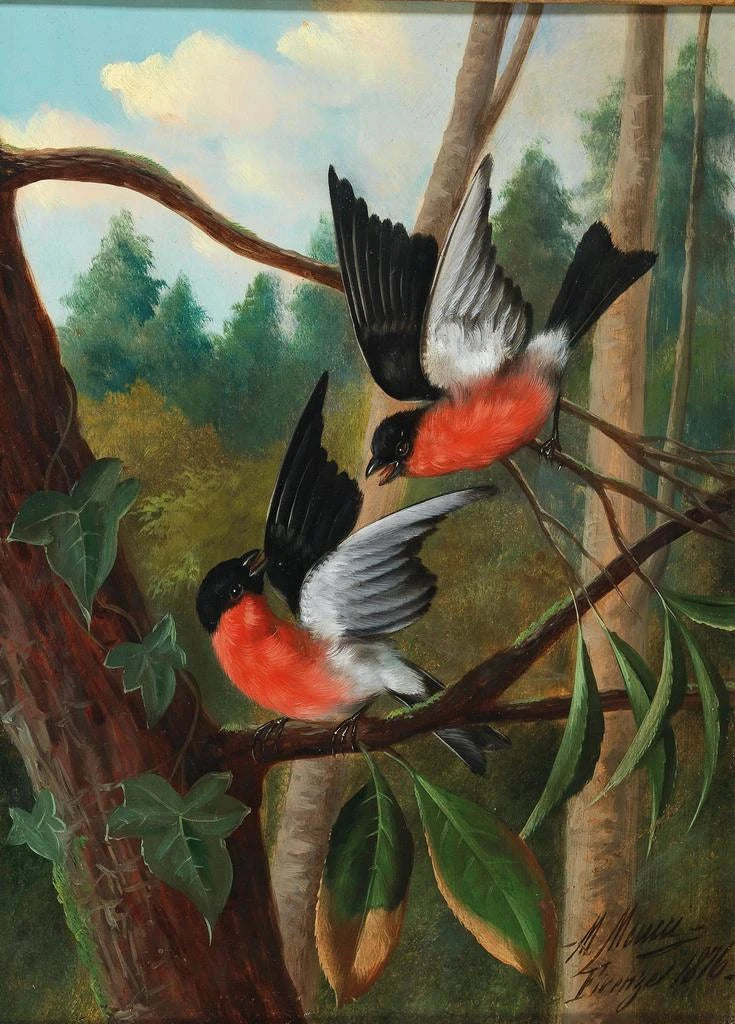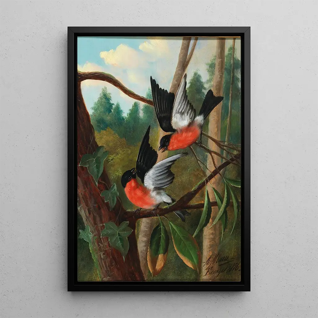 Nella riproduzione di Due uccelli in disputa, Michelangelo Meucci ci immerge nel cuore di una scena animata e ricca di dinamismo. I colori vivaci, dai blu profondi ai rossi vivaci, illustrano la tensione e l'energia del momento catturato. La tecnica di Meucci, caratterizzata da dettagli minuziosi e contrasti sorprendenti, permette di percepire quasi il movimento degli uccelli. Quest'opera, allo stesso tempo viva ed espressiva, evoca le lotte e le rivalità che esistono nel regno animale, offrendo anche una riflessione sulla natura e le sue interazioni.