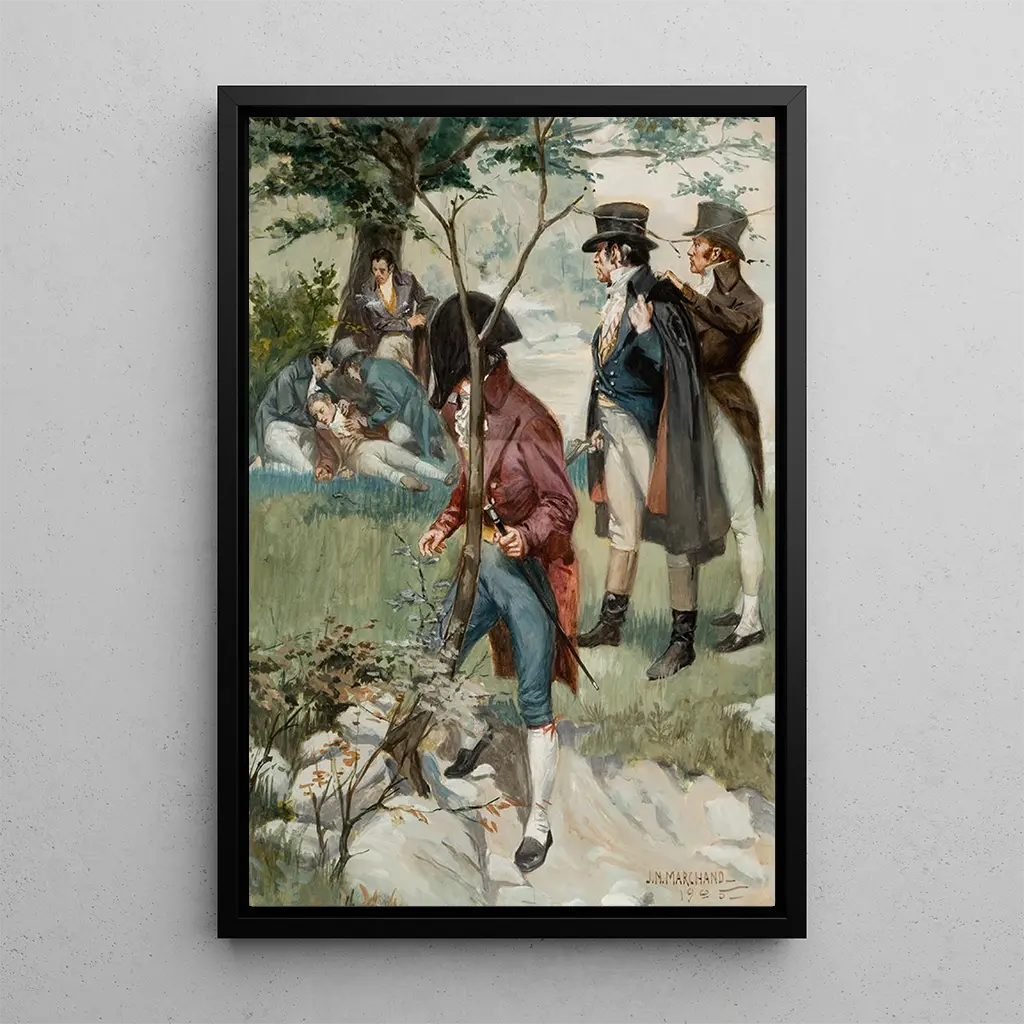 John Norval Marchand, attivo all'inizio del XX secolo, è conosciuto per le sue opere che esplorano i temi della rivalità e del conflitto. Il suo stile, influenzato dal movimento impressionista e dalle tecniche della pittura accademica, si distingue per la capacità di catturare il movimento e l'emozione. "Duelli" illustra perfettamente il suo talento nel rappresentare scene cariche di tensione, riflettendo anche un'epoca in cui i duelli erano percepiti come una questione di onore. Marchand è riuscito a imporsi come un artista significativo, esplorando le complessità delle relazioni umane attraverso la sua arte.