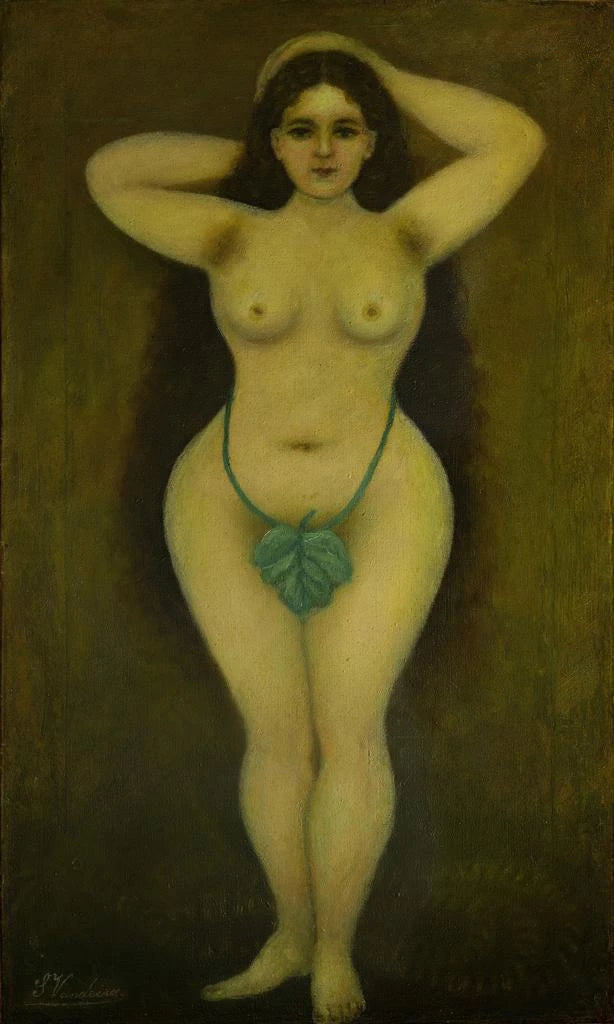 Nella tela "Ève al paradiso", Mariano Silva Vandeira ci trasporta in un giardino dell'Eden vibrante di colori e luce. La composizione è riccamente dettagliata, con tonalità verdognole che evocano la freschezza della natura. Le forme organiche degli alberi e dei fiori sembrano danzare intorno alla figura centrale di Ève, che incarna la bellezza e l'innocenza. La tecnica di Vandeira, mescolando il realismo a un tocco di romanticismo, crea un'atmosfera di serenità e mistero, invitando lo spettatore a contemplare la purezza della creazione.