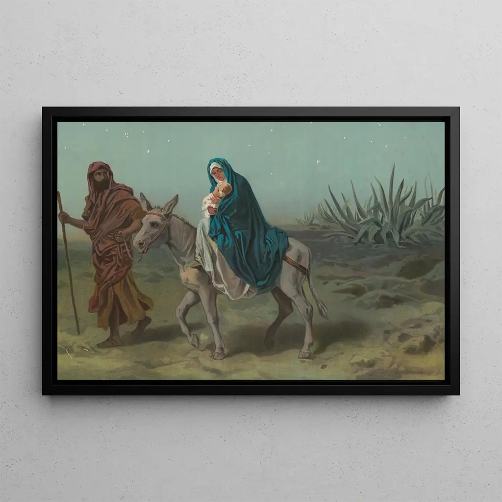 La stampa d'arte di Fuga in Egitto ci immerge in una scena allo stesso tempo drammatica e rasserenante. I colori caldi e terrosi evocano il calore del deserto, mentre le figure umane, seppur modeste, sono intrise di grande dignità. La tecnica di pittura utilizzata dall'artista crea un'atmosfera di movimento, come se si potesse quasi sentire il respiro del vento sulle dune. I dettagli minuziosi degli abiti e dei volti aggiungono una profondità emotiva a quest'opera, invitando lo spettatore a percepire l'angoscia e la speranza dei personaggi in fuga.