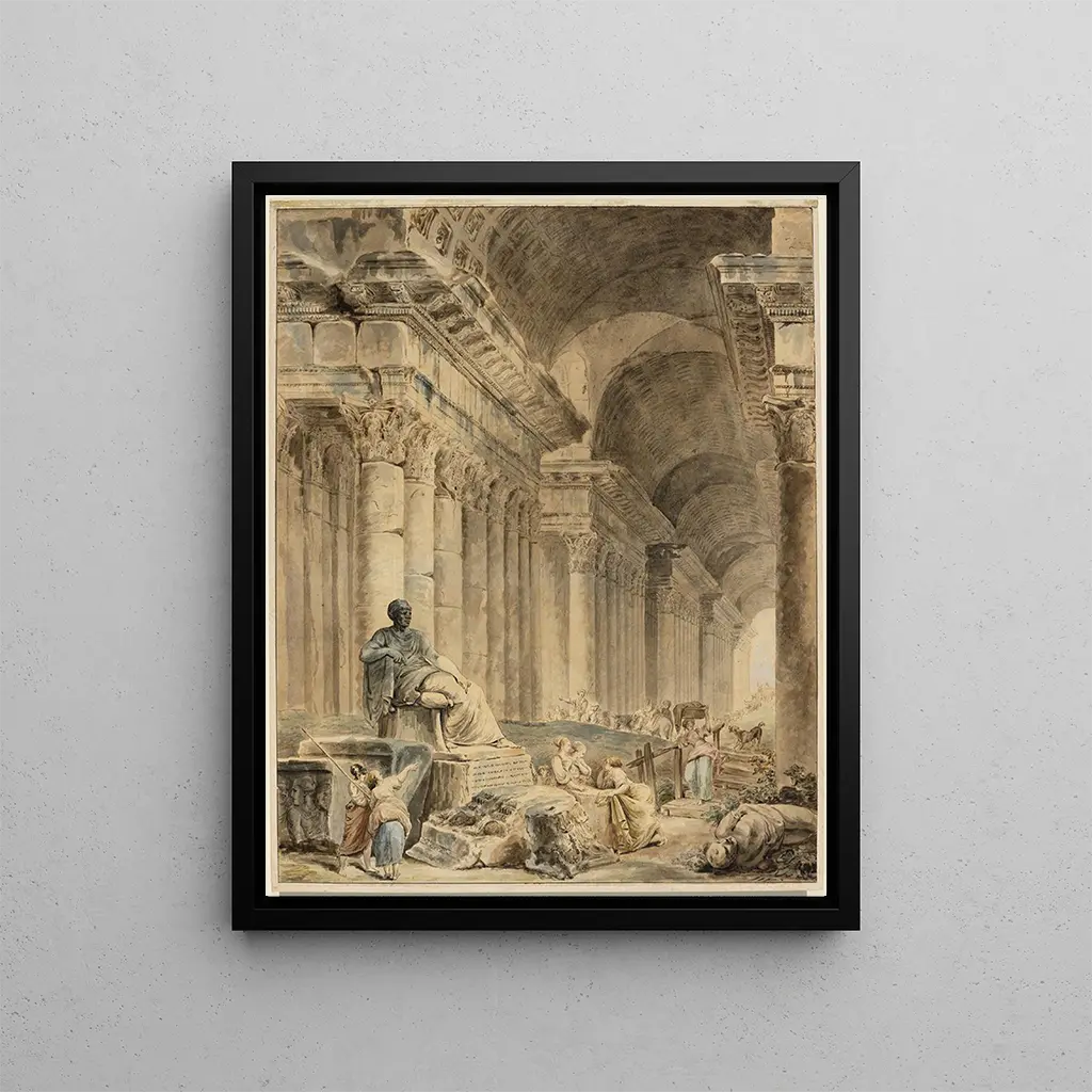 Galleria a colonne con volta e statua antica seduta - Hubert Robert