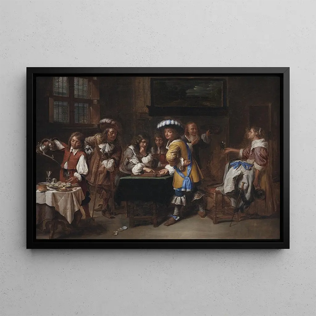 Joueurs de trictrac : un momento sospeso nel tempo La tela "Joueurs de trictrac" di Charles Emmanuel Biset cattura una scena di convivialità e strategia, dove due uomini si affrontano intorno a un gioco da tavolo tradizionale. I colori caldi e terrosi, mescolati a tocchi di luce, creano un'atmosfera intima e accogliente. La composizione, accuratamente equilibrata, attira lo sguardo verso i protagonisti, mentre lo sfondo evoca un interno riccamente decorato, tipico dell'epoca. Quest'opera invita alla contemplazione, rivelando le sottigliezze delle interazioni umane e l'importanza del gioco nella vita sociale del XVII secolo. Charles Emmanuel Biset : un maestro del genere Charles Emmanuel Biset, attivo nel XVII secolo, è riconosciuto per le sue scene di genere che illustrano la vita quotidiana con una sensibilità notevole. Influenzato dai maestri fiamminghi, ha saputo sviluppare uno stile che unisce realismo e sensibilità. Le sue opere, spesso intrise di una certa malinconia, testimoniano un'epoca in cui i giochi da tavolo erano al centro delle interazioni sociali. Sebbene meno conosciuto di alcuni suoi contemporanei, Biset ha lasciato un'impronta indelebile sul genere, offrendo una visione unica della vita borghese del suo tempo. Una proposta decorativa con molteplici vantaggi La riproduzione "Joueurs de trictrac" è un pezzo decorativo ideale per arricchire il vostro interno, che sia in un salotto, un ufficio o una camera da letto. La qualità di stampa e la fedeltà dei colori rendono omaggio all'opera originale, portando un tocco di eleganza e cultura nel vostro spazio. Questo quadro invita alla riflessione e alla discussione, trasformando ogni sguardo in un momento di evasione. Integrando questa stampa d'arte nella vostra decorazione, offrite al vostro ambiente un'atmosfera calda e conviviale, celebrando allo stesso tempo l'arte e la storia.