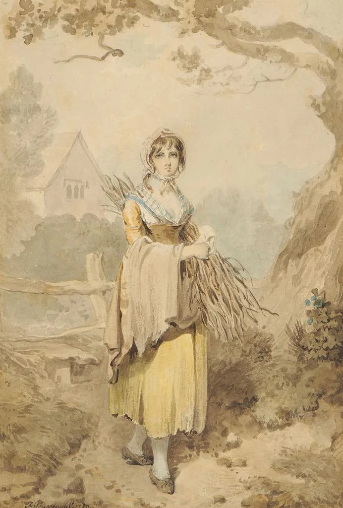 In questa delicata opera, la giovane ragazza che raccoglie legna si svela in un paesaggio rurale, immerso in una luce dolce e calda. I colori pastello, dominati da tonalità di verde e marrone, evocano la serenità della natura. La tecnica di Francis Wheatley, che combina acquerello e olio, conferisce alla tela un'atmosfera leggera e ariosa. La postura aggraziata della giovane ragazza, concentrata sul suo compito, invita a una contemplazione pacifica, quasi meditativa, di un momento semplice ma carico di poesia.
