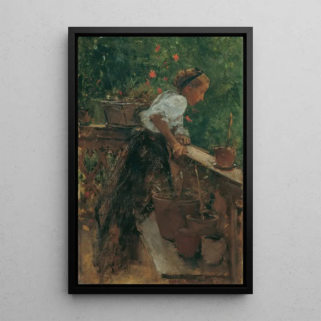 In "Giovane contadina sul balcon", August von Pettenkofen cattura l'essenza della vita semplice e autentica attraverso lo sguardo di una giovane donna. La composizione mette in evidenza la dolcezza dei tratti del suo volto, illuminato dalla luce naturale che filtra attraverso gli elementi del decoro. I colori terrosi e i tocchi di verde evocano la natura circostante, creando un'atmosfera pacifica e contemplativa. Questo quadro è un vero invito ad apprezzare la bellezza dei momenti quotidiani, dove giovinezza e natura si incontrano.