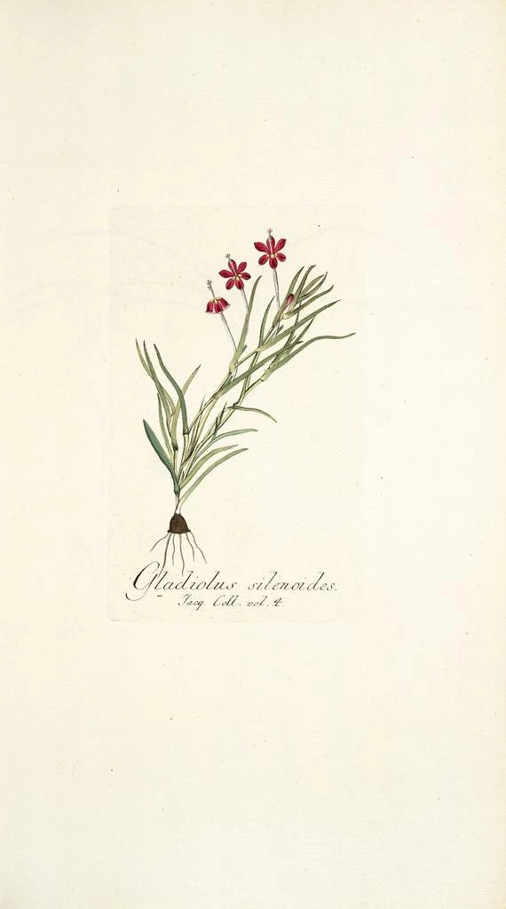 Nikolaus Joseph Freiherr von Jacquin, figura di spicco del XVIII secolo, ha saputo unire arte e scienza nelle sue opere botaniche. I suoi viaggi in Sud America hanno arricchito la sua conoscenza delle piante, influenzando il suo approccio artistico. Gladiolus silenoides è il riflesso del suo impegno nel rappresentare la flora con precisione, integrando al contempo un'estetica raffinata. In qualità di botanico, Jacquin ha contribuito alla classificazione delle specie e alla diffusione delle conoscenze botaniche in Europa. Il suo lavoro ha aperto la strada a una migliore comprensione della natura, facendolo diventare un pioniere nel campo dell'illustrazione botanica.