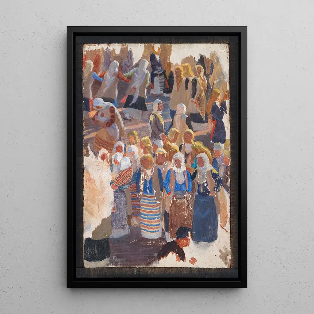 La riproduzione Gruppi di donne danzanti Megara di Niels Skovgaard presenta una scena vibrante in cui diverse donne si dedicano a una danza collettiva. I movimenti fluidi e sincronizzati delle danzatrici creano una dinamica coinvolgente, mentre i colori vivaci, che vanno dal rosso al verde, infondono un'energia contagiosa all'opera. La tecnica di Skovgaard, che combina realismo e tocchi impressionisti, permette di percepire la gioia e l'esuberanza di questo momento festoso. Ogni volto, ogni gesto è accuratamente reso, invitando lo spettatore a immergersi nell'universo della danza.